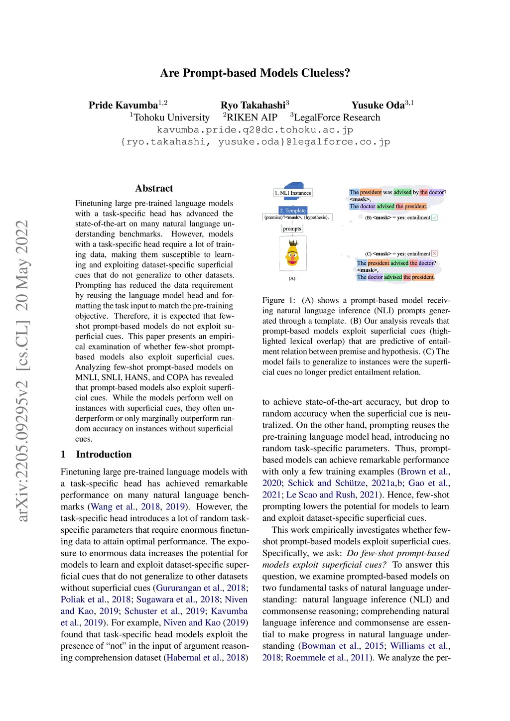 Finetuning large pre-trained language models with a task-specific head has advanced the state-of-the-art on many natural language understanding benchmarks. However, models with a task-specific head require a lot of training data, making them susceptible to learning and exploiting dataset-specific superficial cues that do not generalize to other datasets. Prompting has reduced the data requirement by reusing the language model head and formatting the task input to match the pre-training objective. Therefore, it is expected that few-shot prompt-based models do not exploit superficial cues. This paper presents an empirical examination of whether few-shot prompt-based models also exploit superficial cues. Analyzing few-shot prompt-based models on MNLI, SNLI, HANS, and COPA has revealed that prompt-based models also exploit superficial cues. While the models perform well on instances with superficial cues, they often underperform or only marginally outperform random accuracy on instances without superficial cues.