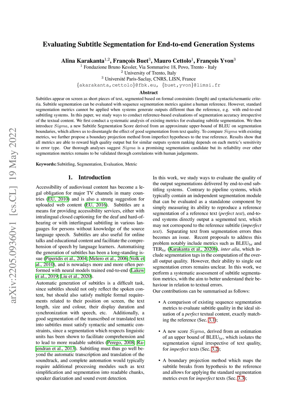 Subtitles appear on screen as short pieces of text, segmented based on formal constraints (length) and syntactic/semantic criteria. Subtitle segmentation can be evaluated with sequence segmentation metrics against a human reference. However, standard segmentation metrics cannot be applied when systems generate outputs different than the reference, e.g. with end-to-end subtitling systems. In this paper, we study ways to conduct reference-based evaluations of segmentation accuracy irrespective of the textual content. We first conduct a systematic analysis of existing metrics for evaluating subtitle segmentation. We then introduce , a new Subtitle Segmentation Score derived from an approximate upper-bound of BLEU on segmentation boundaries, which allows us to disentangle the effect of good segmentation from text quality. To compare with existing metrics, we further propose a boundary projection method from imperfect hypotheses to the true reference. Results show that all metrics are able to reward high quality output but for similar outputs system ranking depends on each metric's sensitivity to error type. Our thorough analyses suggest is a promising segmentation candidate but its reliability over other segmentation metrics remains to be validated through correlations with human judgements.
