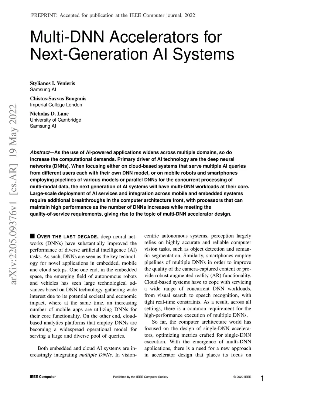 As the use of AI-powered applications widens across multiple domains, so do increase the computational demands. Primary driver of AI technology are the deep neural networks (DNNs). When focusing either on cloud-based systems that serve multiple AI queries from different users each with their own DNN model, or on mobile robots and smartphones employing pipelines of various models or parallel DNNs for the concurrent processing of multi-modal data, the next generation of AI systems will have multi-DNN workloads at their core. Large-scale deployment of AI services and integration across mobile and embedded systems require additional breakthroughs in the computer architecture front, with processors that can maintain high performance as the number of DNNs increases while meeting the quality-of-service requirements, giving rise to the topic of multi-DNN accelerator design.