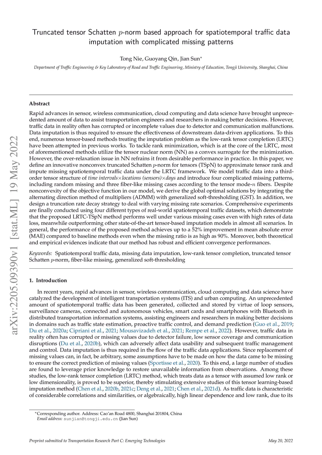 Rapid advances in sensor, wireless communication, cloud computing and data science have brought unprecedented amount of data to assist transportation engineers and researchers in making better decisions. However, traffic data in reality often has corrupted or incomplete values due to detector and communication malfunctions. Data imputation is thus required to ensure the effectiveness of downstream data-driven applications. To this end, numerous tensor-based methods treating the imputation problem as the low-rank tensor completion (LRTC) have been attempted in previous works. To tackle rank minimization, which is at the core of the LRTC, most of aforementioned methods utilize the tensor nuclear norm (NN) as a convex surrogate for the minimization. However, the over-relaxation issue in NN refrains it from desirable performance in practice. In this paper, we define an innovative nonconvex truncated Schatten p-norm for tensors (TSpN) to approximate tensor rank and impute missing spatiotemporal traffic data under the LRTC framework. We model traffic data into a third-order tensor structure of (time intervals,locations (sensors),days) and introduce four complicated missing patterns, including random missing and three fiber-like missing cases according to the tensor mode-n fibers. Despite nonconvexity of the objective function in our model, we derive the global optimal solutions by integrating the alternating direction method of multipliers (ADMM) with generalized soft-thresholding (GST). In addition, we design a truncation rate decay strategy to deal with varying missing rate scenarios. Comprehensive experiments are finally conducted using real-world spatiotemporal datasets, which demonstrate that the proposed LRTC-TSpN method performs well under various missing cases, meanwhile outperforming other SOTA tensor-based imputation models in almost all scenarios.