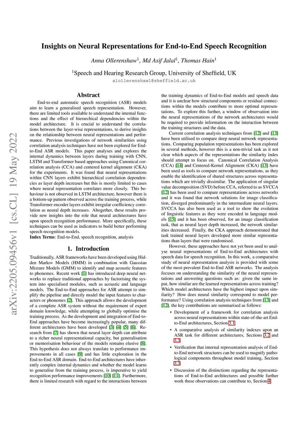 End-to-end automatic speech recognition (ASR) models aim to learn a generalised speech representation. However, there are limited tools available to understand the internal functions and the effect of hierarchical dependencies within the model architecture. It is crucial to understand the correlations between the layer-wise representations, to derive insights on the relationship between neural representations and performance. Previous investigations of network similarities using correlation analysis techniques have not been explored for End-to-End ASR models. This paper analyses and explores the internal dynamics between layers during training with CNN, LSTM and Transformer based approaches using Canonical correlation analysis (CCA) and centered kernel alignment (CKA) for the experiments. It was found that neural representations within CNN layers exhibit hierarchical correlation dependencies as layer depth increases but this is mostly limited to cases where neural representation correlates more closely. This behaviour is not observed in LSTM architecture, however there is a bottom-up pattern observed across the training process, while Transformer encoder layers exhibit irregular coefficiency correlation as neural depth increases. Altogether, these results provide new insights into the role that neural architectures have upon speech recognition performance. More specifically, these techniques can be used as indicators to build better performing speech recognition models.