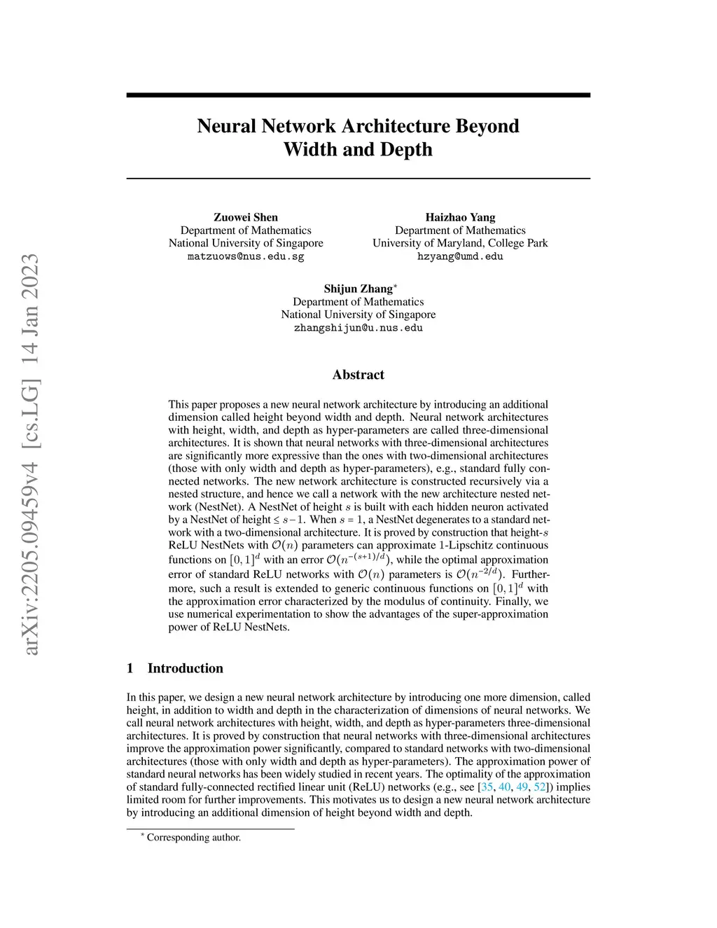 This paper proposes a new neural network architecture by introducing an additional dimension called height beyond width and depth. Neural network architectures with height, width, and depth as hyper-parameters are called three-dimensional architectures. It is shown that neural networks with three-dimensional architectures are significantly more expressive than the ones with two-dimensional architectures (those with only width and depth as hyper-parameters), e.g., standard fully connected networks. The new network architecture is constructed recursively via a nested structure, and hence we call a network with the new architecture nested network (NestNet). A NestNet of height is built with each hidden neuron activated by a NestNet of height . When , a NestNet degenerates to a standard network with a two-dimensional architecture. It is proved by construction that height- ReLU NestNets with parameters can approximate -Lipschitz continuous functions on with an error , while the optimal approximation error of standard ReLU networks with parameters is . Furthermore, such a result is extended to generic continuous functions on with the approximation error characterized by the modulus of continuity. Finally, we use numerical experimentation to show the advantages of the super-approximation power of ReLU NestNets.