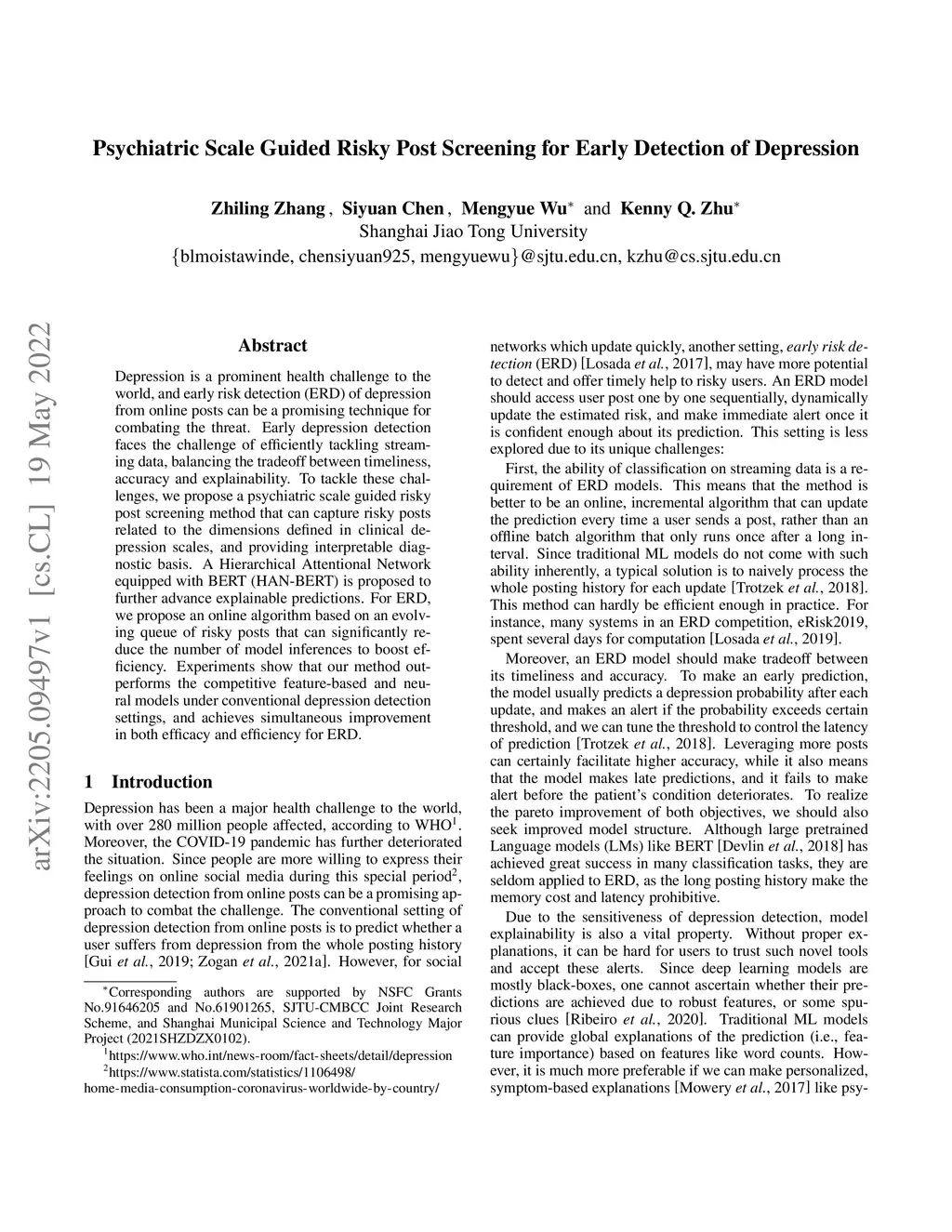 Depression is a prominent health challenge to the world, and early risk detection (ERD) of depression from online posts can be a promising technique for combating the threat. Early depression detection faces the challenge of efficiently tackling streaming data, balancing the tradeoff between timeliness, accuracy and explainability. To tackle these challenges, we propose a psychiatric scale guided risky post screening method that can capture risky posts related to the dimensions defined in clinical depression scales, and providing interpretable diagnostic basis. A Hierarchical Attentional Network equipped with BERT (HAN-BERT) is proposed to further advance explainable predictions. For ERD, we propose an online algorithm based on an evolving queue of risky posts that can significantly reduce the number of model inferences to boost efficiency. Experiments show that our method outperforms the competitive feature-based and neural models under conventional depression detection settings, and achieves simultaneous improvement in both efficacy and efficiency for ERD.