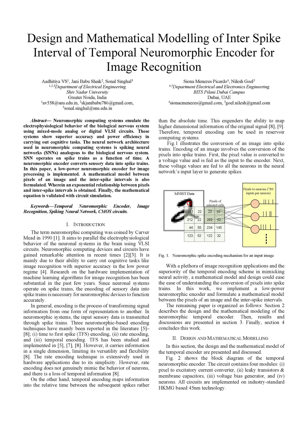 Neuromorphic computing systems emulate the electrophysiological behavior of the biological nervous system using mixed-mode analog or digital VLSI circuits. These systems show superior accuracy and power efficiency in carrying out cognitive tasks. The neural network architecture used in neuromorphic computing systems is spiking neural networks (SNNs) analogous to the biological nervous system. SNN operates on spike trains as a function of time. A neuromorphic encoder converts sensory data into spike trains. In this paper, a low-power neuromorphic encoder for image processing is implemented. A mathematical model between pixels of an image and the inter-spike intervals is also formulated. Wherein an exponential relationship between pixels and inter-spike intervals is obtained. Finally, the mathematical equation is validated with circuit simulation.