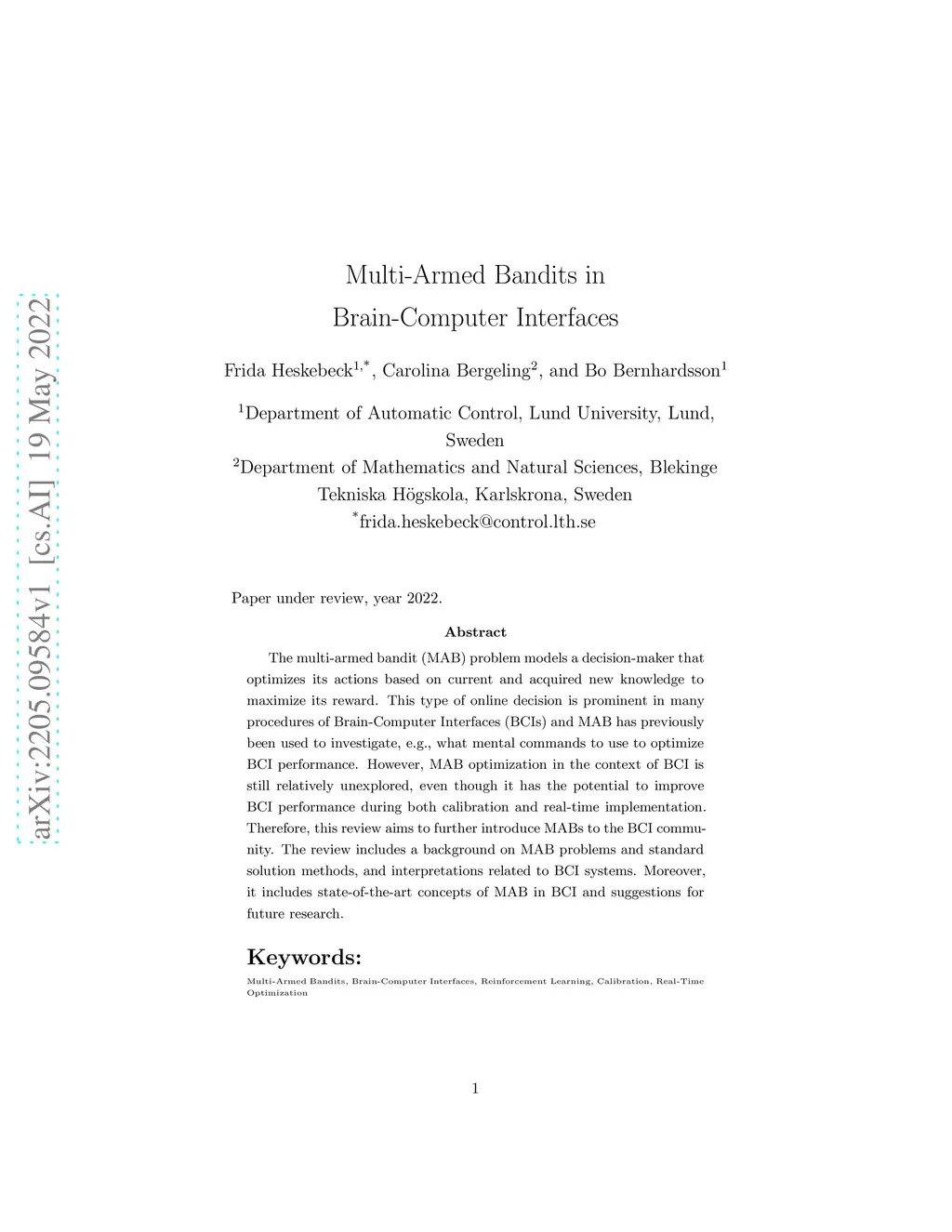 The multi-armed bandit (MAB) problem models a decision-maker that optimizes its actions based on current and acquired new knowledge to maximize its reward. This type of online decision is prominent in many procedures of Brain-Computer Interfaces (BCIs) and MAB has previously been used to investigate, e.g., what mental commands to use to optimize BCI performance. However, MAB optimization in the context of BCI is still relatively unexplored, even though it has the potential to improve BCI performance during both calibration and real-time implementation. Therefore, this review aims to further introduce MABs to the BCI community. The review includes a background on MAB problems and standard solution methods, and interpretations related to BCI systems. Moreover, it includes state-of-the-art concepts of MAB in BCI and suggestions for future research.