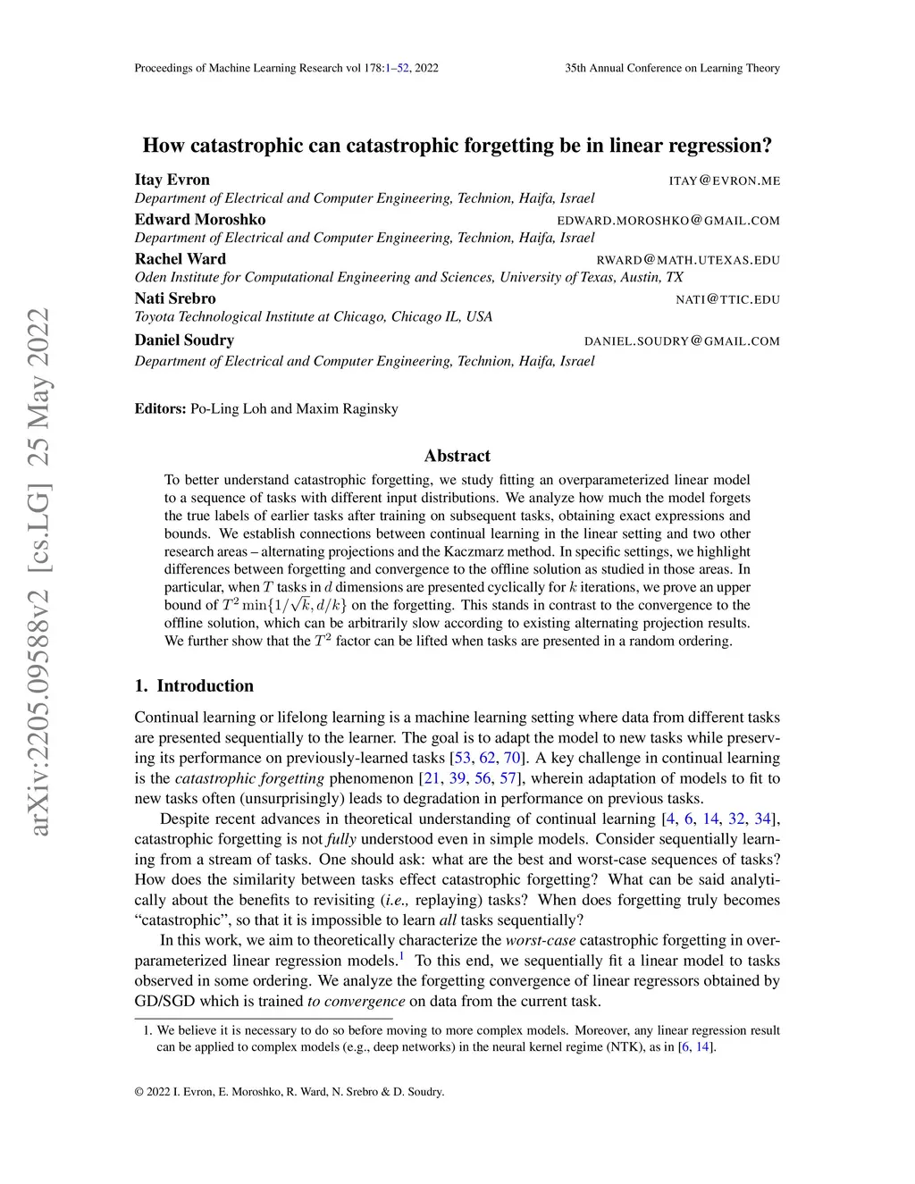 To better understand catastrophic forgetting, we study fitting an overparameterized linear model to a sequence of tasks with different input distributions. We analyze how much the model forgets the true labels of earlier tasks after training on subsequent tasks, obtaining exact expressions and bounds. We establish connections between continual learning in the linear setting and two other research areas: alternating projections and the Kaczmarz method. In specific settings, we highlight differences between forgetting and convergence to the offline solution as studied in those areas. In particular, when T tasks in d dimensions are presented cyclically for k iterations, we prove an upper bound of T^2 * min{1/sqrt(k), d/k} on the forgetting. This stands in contrast to the convergence to the offline solution, which can be arbitrarily slow according to existing alternating projection results. We further show that the T^2 factor can be lifted when tasks are presented in a random ordering.