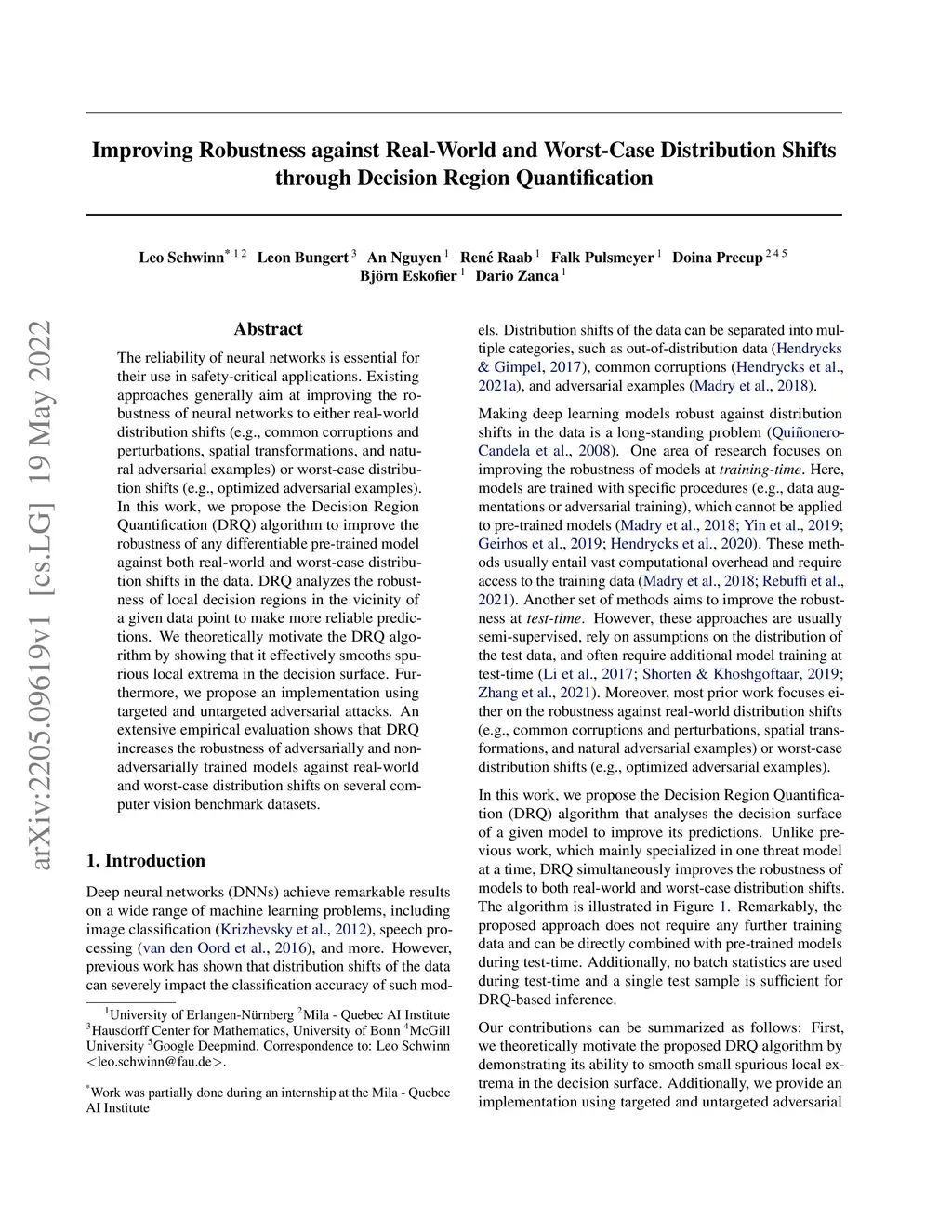 The reliability of neural networks is essential for their use in safety-critical applications. Existing approaches generally aim at improving the robustness of neural networks to either real-world distribution shifts (e.g., common corruptions and perturbations, spatial transformations, and natural adversarial examples) or worst-case distribution shifts (e.g., optimized adversarial examples). In this work, we propose the Decision Region Quantification (DRQ) algorithm to improve the robustness of any differentiable pre-trained model against both real-world and worst-case distribution shifts in the data. DRQ analyzes the robustness of local decision regions in the vicinity of a given data point to make more reliable predictions. We theoretically motivate the DRQ algorithm by showing that it effectively smooths spurious local extrema in the decision surface. Furthermore, we propose an implementation using targeted and untargeted adversarial attacks. An extensive empirical evaluation shows that DRQ increases the robustness of adversarially and non-adversarially trained models against real-world and worst-case distribution shifts on several computer vision benchmark datasets.