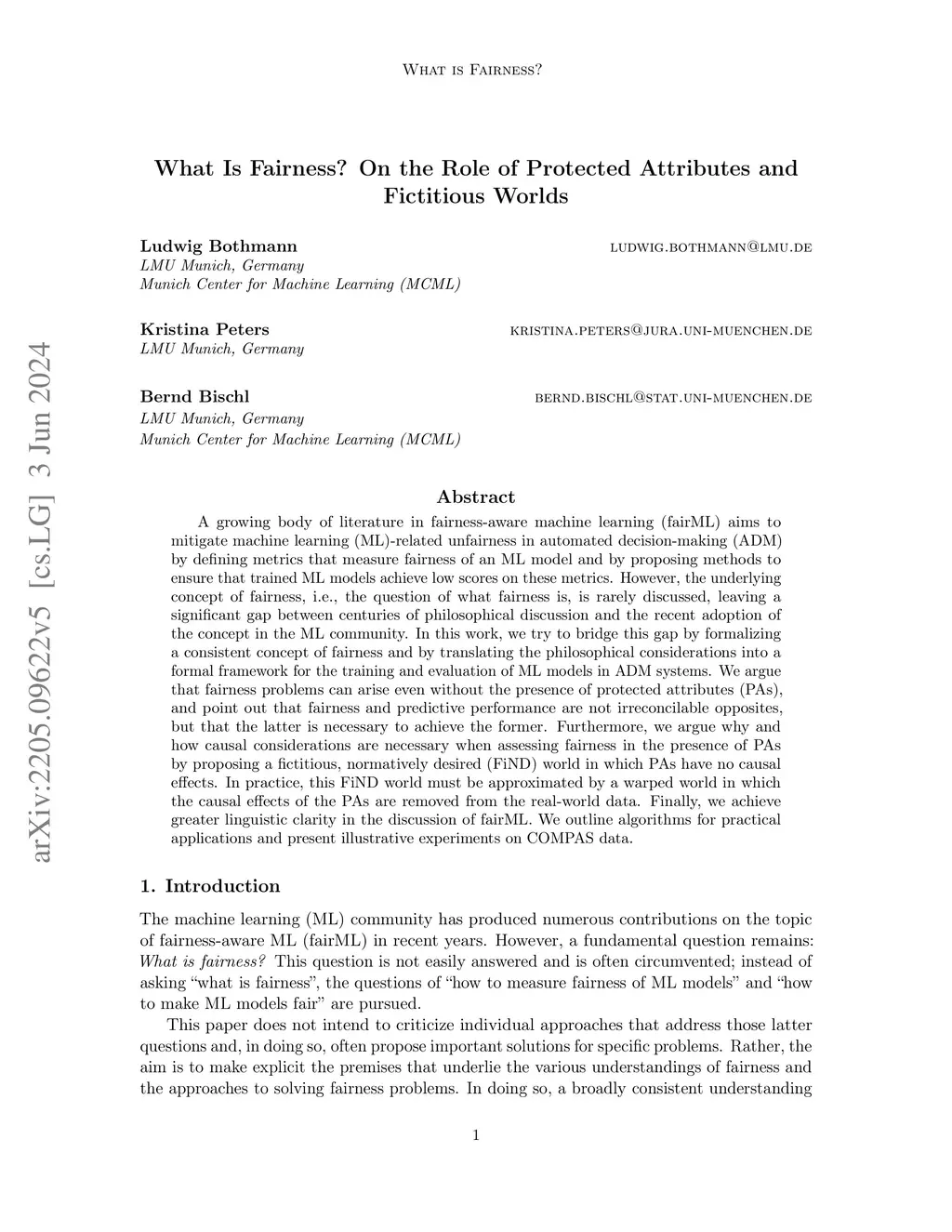 A growing body of literature in fairness-aware machine learning (fairML) aims to mitigate machine learning (ML)-related unfairness in automated decision-making (ADM) by defining metrics that measure fairness of an ML model and by proposing methods to ensure that trained ML models achieve low scores on these metrics. However, the underlying concept of fairness, i.e., the question of what fairness is, is rarely discussed, leaving a significant gap between centuries of philosophical discussion and the recent adoption of the concept in the ML community. In this work, we try to bridge this gap by formalizing a consistent concept of fairness and by translating the philosophical considerations into a formal framework for the training and evaluation of ML models in ADM systems. We argue that fairness problems can arise even without the presence of protected attributes (PAs), and point out that fairness and predictive performance are not irreconcilable opposites, but that the latter is necessary to achieve the former. Furthermore, we argue why and how causal considerations are necessary when assessing fairness in the presence of PAs by proposing a fictitious, normatively desired (FiND) world in which PAs have no causal effects. In practice, this FiND world must be approximated by a warped world in which the causal effects of the PAs are removed from the real-world data. Finally, we achieve greater linguistic clarity in the discussion of fairML. We outline algorithms for practical applications and present illustrative experiments on COMPAS data.