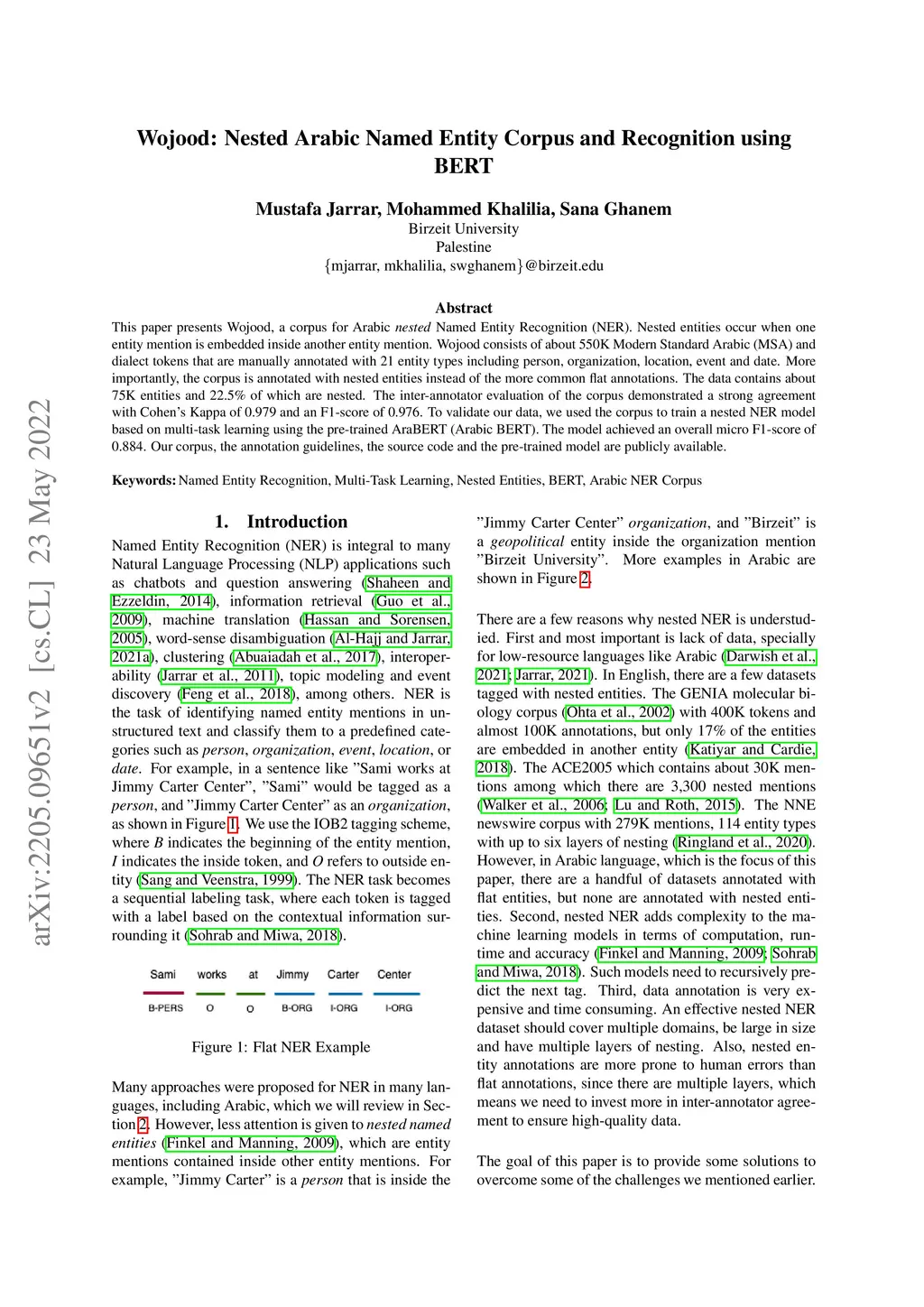 Wojood: Nested Arabic Named Entity Corpus and Recognition using BERT
