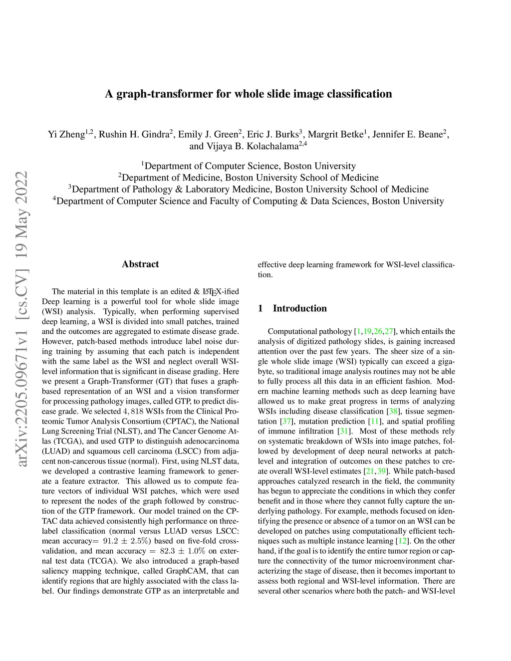 Deep learning is a powerful tool for whole slide image (WSI) analysis. Typically, when performing supervised deep learning, a WSI is divided into small patches, trained and the outcomes are aggregated to estimate disease grade. However, patch-based methods introduce label noise during training by assuming that each patch is independent with the same label as the WSI and neglect overall WSI-level information that is significant in disease grading. Here we present a Graph-Transformer (GT) that fuses a graph-based representation of an WSI and a vision transformer for processing pathology images, called GTP, to predict disease grade. We selected WSIs from the Clinical Proteomic Tumor Analysis Consortium (CPTAC), the National Lung Screening Trial (NLST), and The Cancer Genome Atlas (TCGA), and used GTP to distinguish adenocarcinoma (LUAD) and squamous cell carcinoma (LSCC) from adjacent non-cancerous tissue (normal). First, using NLST data, we developed a contrastive learning framework to generate a feature extractor. This allowed us to compute feature vectors of individual WSI patches, which were used to represent the nodes of the graph followed by construction of the GTP framework. Our model trained on the CPTAC data achieved consistently high performance on three-label classification (normal versus LUAD versus LSCC: mean accuracy ) based on five-fold cross-validation, and mean accuracy on external test data (TCGA). We also introduced a graph-based saliency mapping technique, called GraphCAM, that can identify regions that are highly associated with the class label. Our findings demonstrate GTP as an interpretable and effective deep learning framework for WSI-level classification.
