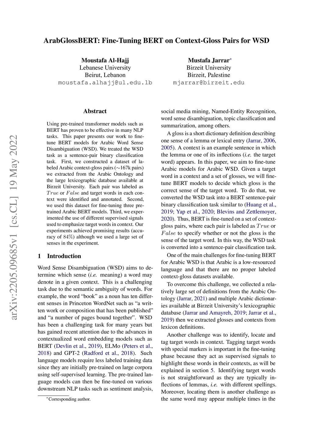 ArabGlossBERT: Fine-Tuning BERT on Context-Gloss Pairs for WSD