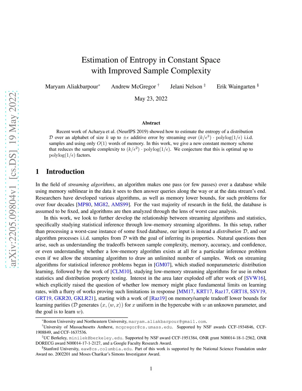 Estimation of Entropy in Constant Space with Improved Sample Complexity