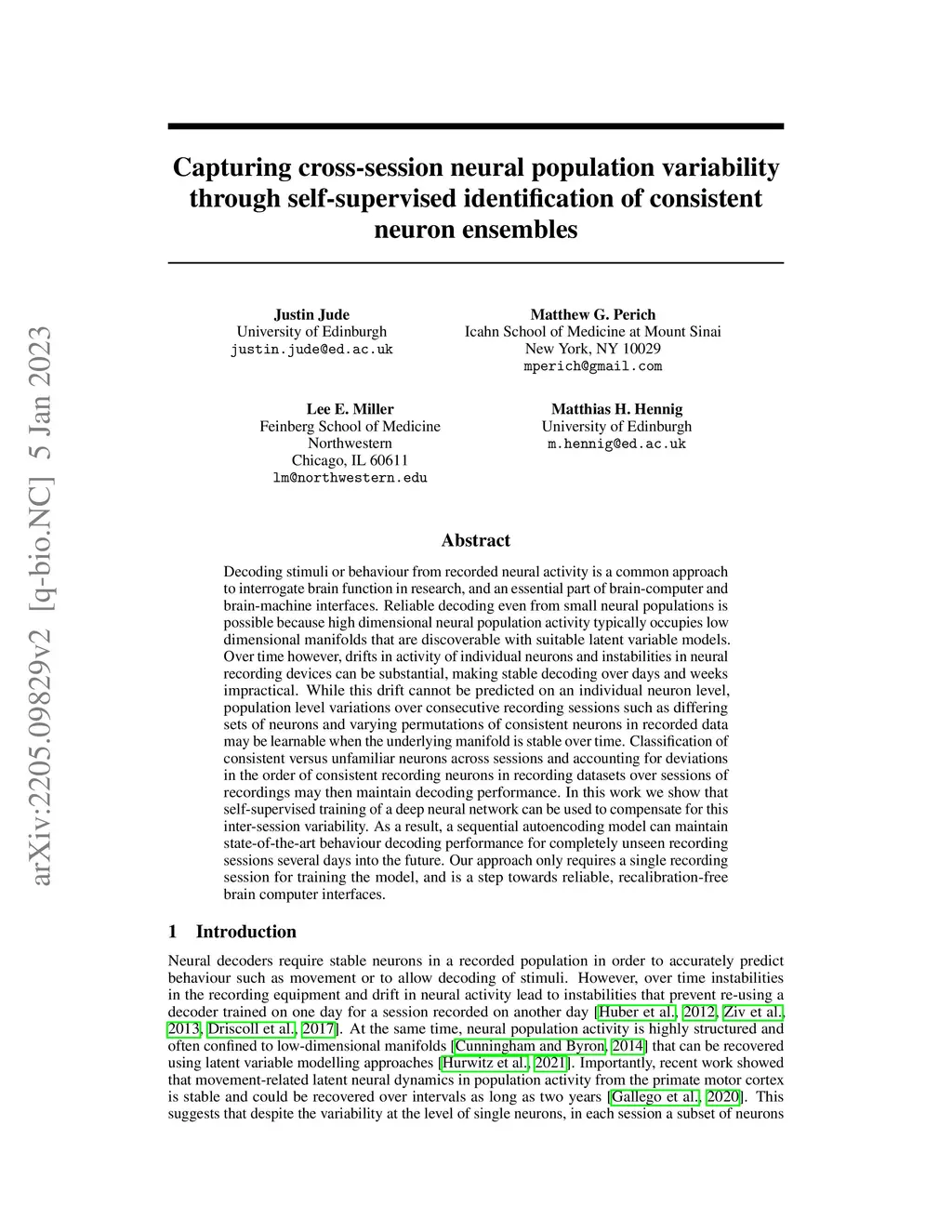 Decoding stimuli or behaviour from recorded neural activity is a common approach to interrogate brain function in research, and an essential part of brain-computer and brain-machine interfaces. Reliable decoding even from small neural populations is possible because high dimensional neural population activity typically occupies low dimensional manifolds that are discoverable with suitable latent variable models. Over time however, drifts in activity of individual neurons and instabilities in neural recording devices can be substantial, making stable decoding over days and weeks impractical. While this drift cannot be predicted on an individual neuron level, population level variations over consecutive recording sessions such as differing sets of neurons and varying permutations of consistent neurons in recorded data may be learnable when the underlying manifold is stable over time. Classification of consistent versus unfamiliar neurons across sessions and accounting for deviations in the order of consistent recording neurons in recording datasets over sessions of recordings may then maintain decoding performance. In this work we show that self-supervised training of a deep neural network can be used to compensate for this inter-session variability. As a result, a sequential autoencoding model can maintain state-of-the-art behaviour decoding performance for completely unseen recording sessions several days into the future. Our approach only requires a single recording session for training the model, and is a step towards reliable, recalibration-free brain computer interfaces.