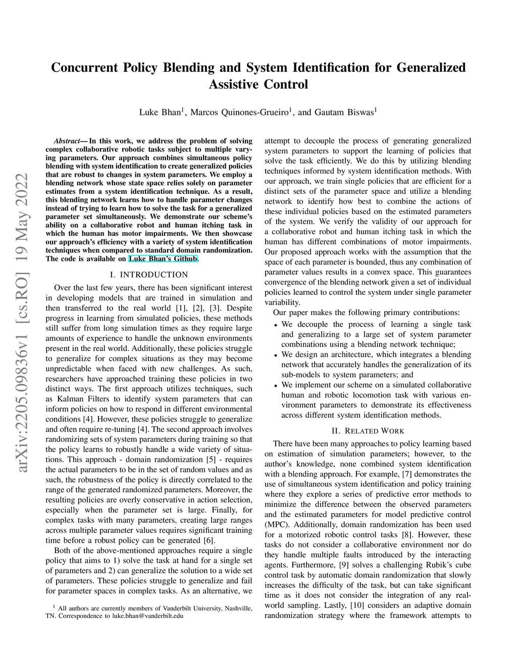 In this work, we address the problem of solving complex collaborative robotic tasks subject to multiple varying parameters. Our approach combines simultaneous policy blending with system identification to create generalized policies that are robust to changes in system parameters. We employ a blending network whose state space relies solely on parameter estimates from a system identification technique. As a result, this blending network learns how to handle parameter changes instead of trying to learn how to solve the task for a generalized parameter set simultaneously. We demonstrate our scheme's ability on a collaborative robot and human itching task in which the human has motor impairments. We then showcase our approach's efficiency with a variety of system identification techniques when compared to standard domain randomization.