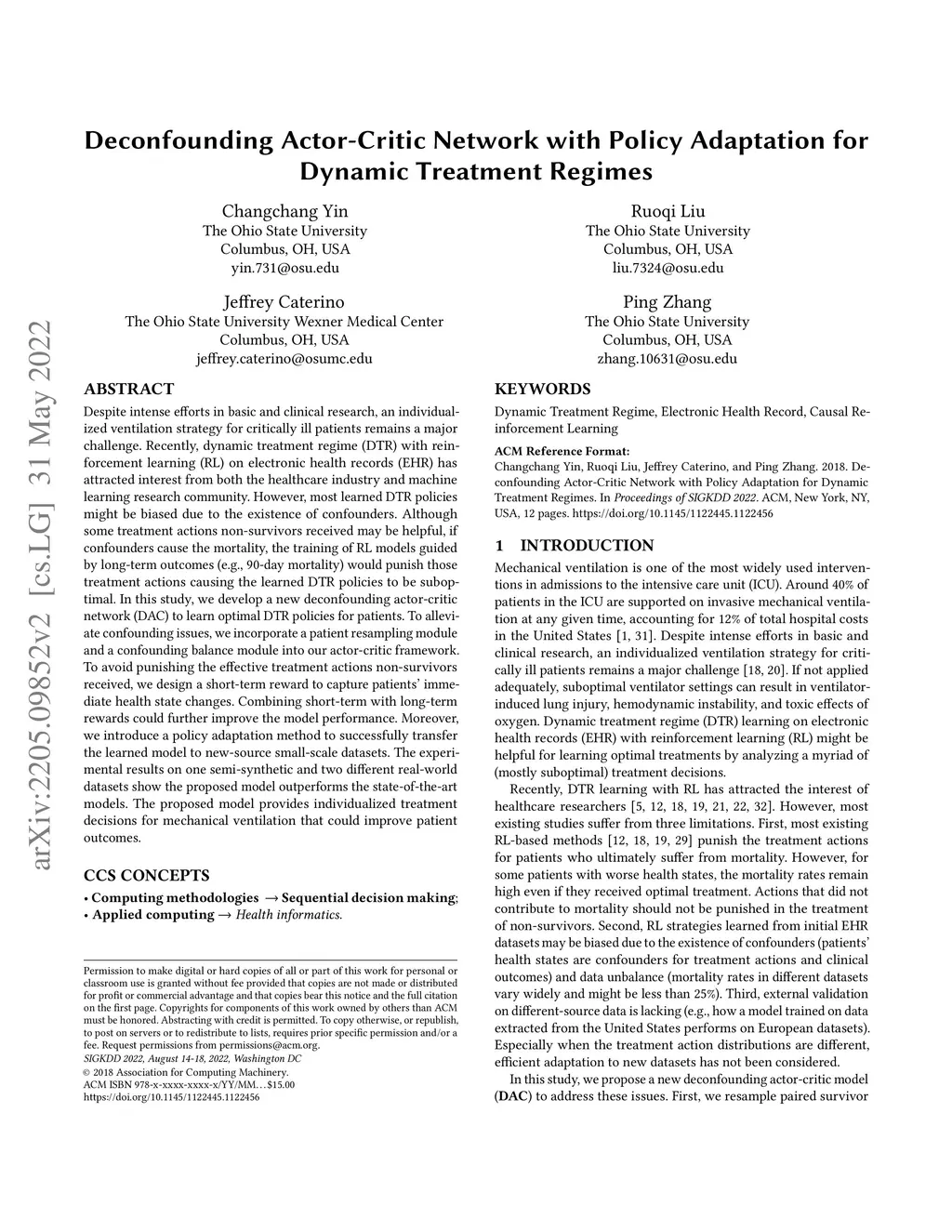 Despite intense efforts in basic and clinical research, an individualized ventilation strategy for critically ill patients remains a major challenge. Recently, dynamic treatment regime (DTR) with reinforcement learning (RL) on electronic health records (EHR) has attracted interest from both the healthcare industry and machine learning research community. However, most learned DTR policies might be biased due to the existence of confounders. Although some treatment actions non-survivors received may be helpful, if confounders cause the mortality, the training of RL models guided by long-term outcomes (e.g., 90-day mortality) would punish those treatment actions causing the learned DTR policies to be suboptimal. In this study, we develop a new deconfounding actor-critic network (DAC) to learn optimal DTR policies for patients. To alleviate confounding issues, we incorporate a patient resampling module and a confounding balance module into our actor-critic framework. To avoid punishing the effective treatment actions non-survivors received, we design a short-term reward to capture patients' immediate health state changes. Combining short-term with long-term rewards could further improve the model performance. Moreover, we introduce a policy adaptation method to successfully transfer the learned model to new-source small-scale datasets. The experimental results on one semi-synthetic and two different real-world datasets show the proposed model outperforms the state-of-the-art models. The proposed model provides individualized treatment decisions for mechanical ventilation that could improve patient outcomes.