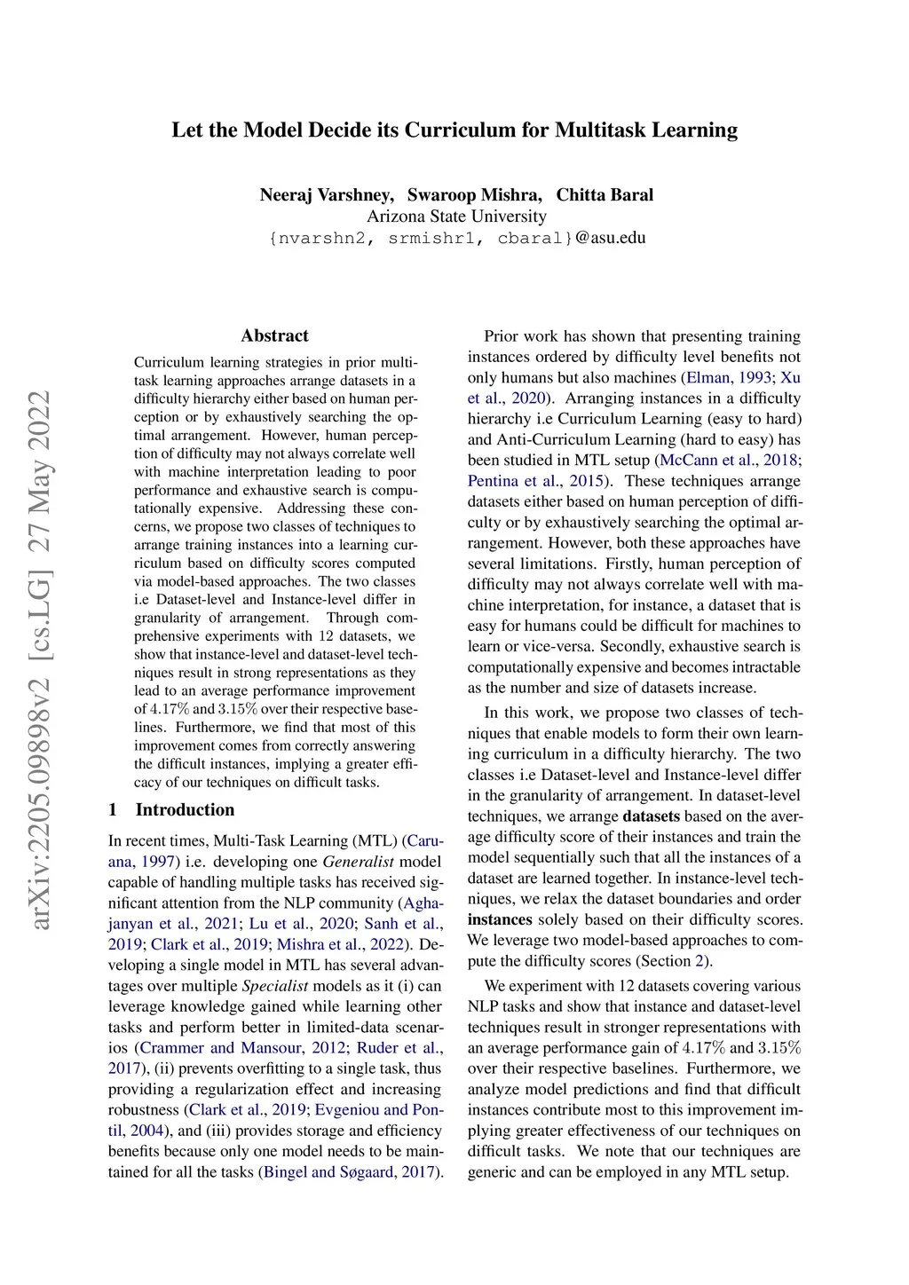Curriculum learning strategies in prior multi-task learning approaches arrange datasets in a difficulty hierarchy either based on human perception or by exhaustively searching the optimal arrangement. However, human perception of difficulty may not always correlate well with machine interpretation leading to poor performance and exhaustive search is computationally expensive. Addressing these concerns, we propose two classes of techniques to arrange training instances into a learning curriculum based on difficulty scores computed via model-based approaches. The two classes i.e Dataset-level and Instance-level differ in granularity of arrangement. Through comprehensive experiments with 12 datasets, we show that instance-level and dataset-level techniques result in strong representations as they lead to an average performance improvement of 4.17% and 3.15% over their respective baselines. Furthermore, we find that most of this improvement comes from correctly answering the difficult instances, implying a greater efficacy of our techniques on difficult tasks.