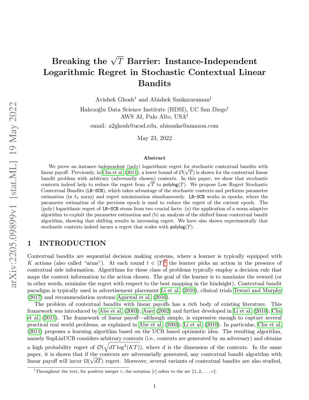 We prove an instance independent (poly) logarithmic regret for stochastic contextual bandits with linear payoff. Previously, in \cite{chu2011contextual}, a lower bound of is shown for the contextual linear bandit problem with arbitrary (adversarily chosen) contexts. In this paper, we show that stochastic contexts indeed help to reduce the regret from to . We propose Low Regret Stochastic Contextual Bandits (\texttt{LR-SCB}), which takes advantage of the stochastic contexts and performs parameter estimation (in norm) and regret minimization simultaneously. \texttt{LR-SCB} works in epochs, where the parameter estimation of the previous epoch is used to reduce the regret of the current epoch. The (poly) logarithmic regret of \texttt{LR-SCB} stems from two crucial facts: (a) the application of a norm adaptive algorithm to exploit the parameter estimation and (b) an analysis of the shifted linear contextual bandit algorithm, showing that shifting results in increasing regret. We have also shown experimentally that stochastic contexts indeed incurs a regret that scales with .