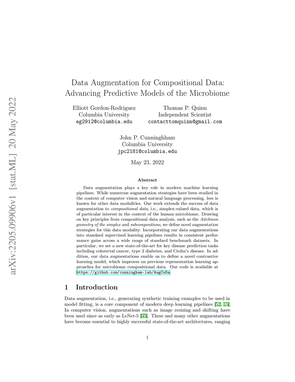 Data augmentation plays a key role in modern machine learning pipelines. While numerous augmentation strategies have been studied in the context of computer vision and natural language processing, less is known for other data modalities. Our work extends the success of data augmentation to compositional data, i.e., simplex-valued data, which is of particular interest in the context of the human microbiome. Drawing on key principles from compositional data analysis, such as the Aitchison geometry of the simplex and subcompositions, we define novel augmentation strategies for this data modality. Incorporating our data augmentations into standard supervised learning pipelines results in consistent performance gains across a wide range of standard benchmark datasets. In particular, we set a new state-of-the-art for key disease prediction tasks including colorectal cancer, type 2 diabetes, and Crohn's disease. In addition, our data augmentations enable us to define a novel contrastive learning model, which improves on previous representation learning approaches for microbiome compositional data. Our code is available at https://github.com/cunningham-lab/AugCoDa.