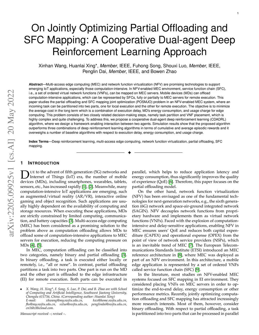 Multi-access edge computing (MEC) and network function virtualization (NFV) are promising technologies to support emerging IoT applications, especially those computation-intensive. In NFV-enabled MEC environment, service function chain (SFC), i.e., a set of ordered virtual network functions (VNFs), can be mapped on MEC servers. Mobile devices (MDs) can offload computation-intensive applications, which can be represented by SFCs, fully or partially to MEC servers for remote execution. This paper studies the partial offloading and SFC mapping joint optimization (POSMJO) problem in an NFV-enabled MEC system, where an incoming task can be partitioned into two parts, one for local execution and the other for remote execution. The objective is to minimize the average cost in the long term which is a combination of execution delay, MD's energy consumption, and usage charge for edge computing. This problem consists of two closely related decision-making steps, namely task partition and VNF placement, which is highly complex and quite challenging. To address this, we propose a cooperative dual-agent deep reinforcement learning (CDADRL) algorithm, where we design a framework enabling interaction between two agents. Simulation results show that the proposed algorithm outperforms three combinations of deep reinforcement learning algorithms in terms of cumulative and average episodic rewards and it overweighs a number of baseline algorithms with respect to execution delay, energy consumption, and usage charge.