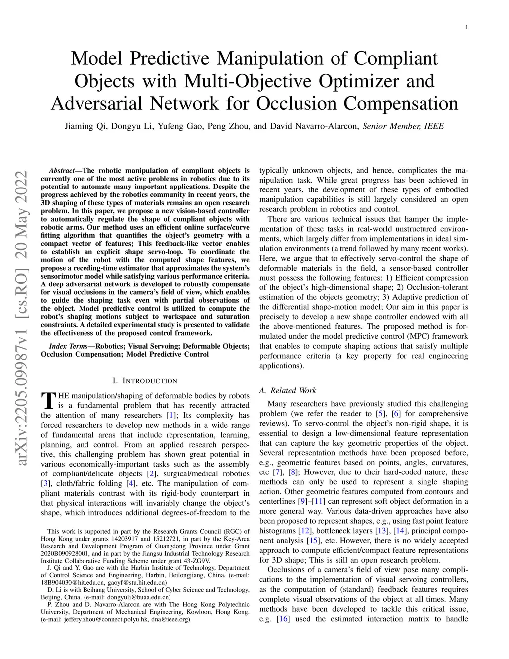 The robotic manipulation of compliant objects is currently one of the most active problems in robotics due to its potential to automate many important applications. Despite the progress achieved by the robotics community in recent years, the 3D shaping of these types of materials remains an open research problem. In this paper, we propose a new vision-based controller to automatically regulate the shape of compliant objects with robotic arms. Our method uses an efficient online surface/curve fitting algorithm that quantifies the object's geometry with a compact vector of features; This feedback-like vector enables to establish an explicit shape servo-loop. To coordinate the motion of the robot with the computed shape features, we propose a receding-time estimator that approximates the system's sensorimotor model while satisfying various performance criteria. A deep adversarial network is developed to robustly compensate for visual occlusions in the camera's field of view, which enables to guide the shaping task even with partial observations of the object. Model predictive control is utilized to compute the robot's shaping motions subject to workspace and saturation constraints. A detailed experimental study is presented to validate the effectiveness of the proposed control framework.