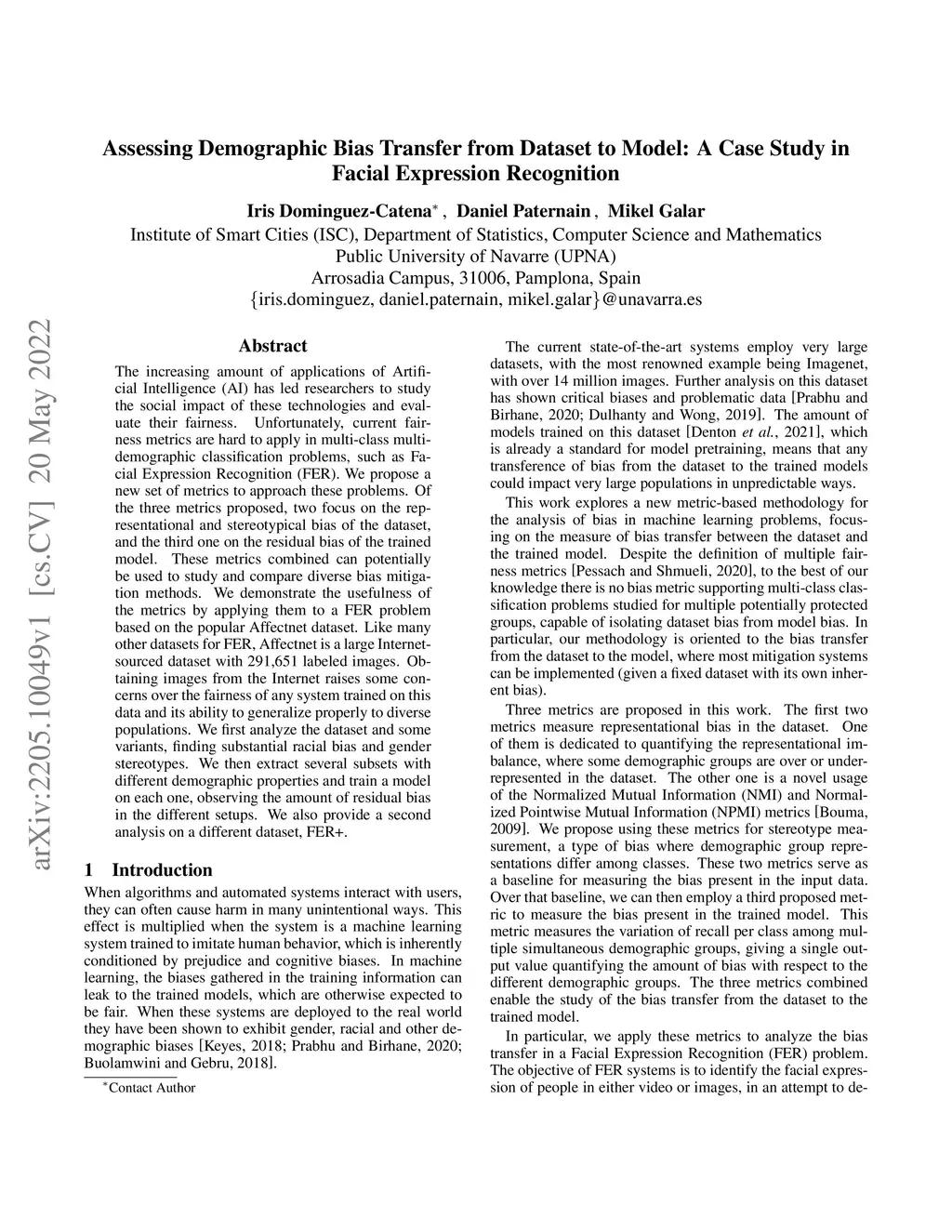 The increasing amount of applications of Artificial Intelligence (AI) has led researchers to study the social impact of these technologies and evaluate their fairness. Unfortunately, current fairness metrics are hard to apply in multi-class multi-demographic classification problems, such as Facial Expression Recognition (FER). We propose a new set of metrics to approach these problems. Of the three metrics proposed, two focus on the representational and stereotypical bias of the dataset, and the third one on the residual bias of the trained model. These metrics combined can potentially be used to study and compare diverse bias mitigation methods. We demonstrate the usefulness of the metrics by applying them to a FER problem based on the popular Affectnet dataset. Like many other datasets for FER, Affectnet is a large Internet-sourced dataset with 291,651 labeled images. Obtaining images from the Internet raises some concerns over the fairness of any system trained on this data and its ability to generalize properly to diverse populations. We first analyze the dataset and some variants, finding substantial racial bias and gender stereotypes. We then extract several subsets with different demographic properties and train a model on each one, observing the amount of residual bias in the different setups. We also provide a second analysis on a different dataset, FER+.