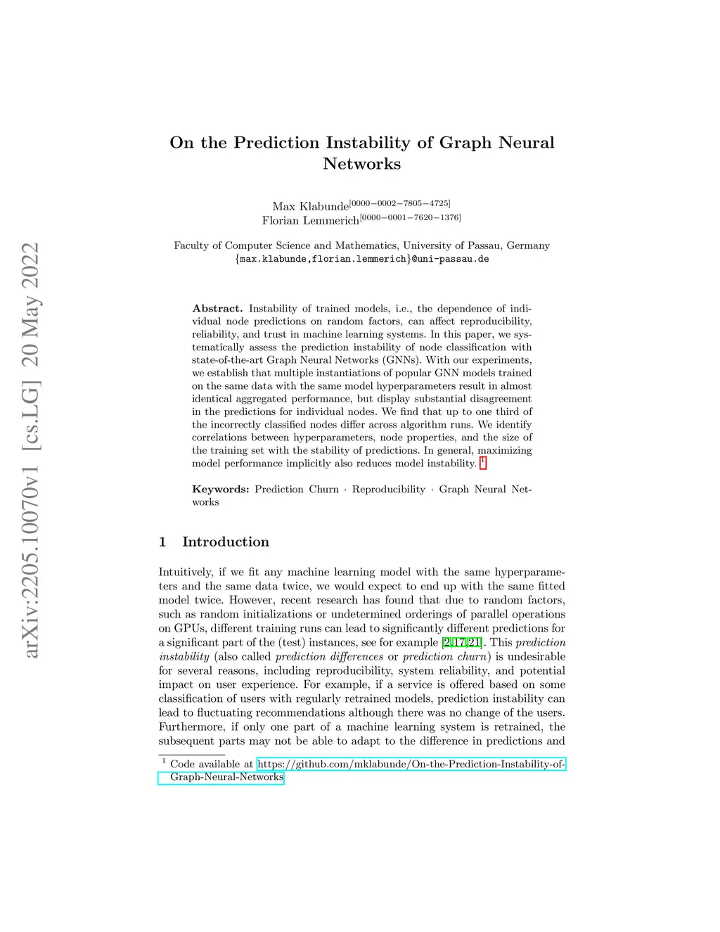 Instability of trained models, i.e., the dependence of individual node predictions on random factors, can affect reproducibility, reliability, and trust in machine learning systems. In this paper, we systematically assess the prediction instability of node classification with state-of-the-art Graph Neural Networks (GNNs). With our experiments, we establish that multiple instantiations of popular GNN models trained on the same data with the same model hyperparameters result in almost identical aggregated performance but display substantial disagreement in the predictions for individual nodes. We find that up to one third of the incorrectly classified nodes differ across algorithm runs. We identify correlations between hyperparameters, node properties, and the size of the training set with the stability of predictions. In general, maximizing model performance implicitly also reduces model instability.