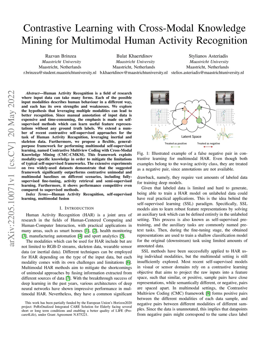 Human Activity Recognition is a field of research where input data can take many forms. Each of the possible input modalities describes human behaviour in a different way, and each has its own strengths and weaknesses. We explore the hypothesis that leveraging multiple modalities can lead to better recognition. Since manual annotation of input data is expensive and time-consuming, the emphasis is made on self-supervised methods which can learn useful feature representations without any ground truth labels. We extend a number of recent contrastive self-supervised approaches for the task of Human Activity Recognition, leveraging inertial and skeleton data. Furthermore, we propose a flexible, general-purpose framework for performing multimodal self-supervised learning, named Contrastive Multiview Coding with Cross-Modal Knowledge Mining (CMC-CMKM). This framework exploits modality-specific knowledge in order to mitigate the limitations of typical self-supervised frameworks. The extensive experiments on two widely-used datasets demonstrate that the suggested framework significantly outperforms contrastive unimodal and multimodal baselines on different scenarios, including fully-supervised fine-tuning, activity retrieval and semi-supervised learning. Furthermore, it shows performance competitive even compared to supervised methods.