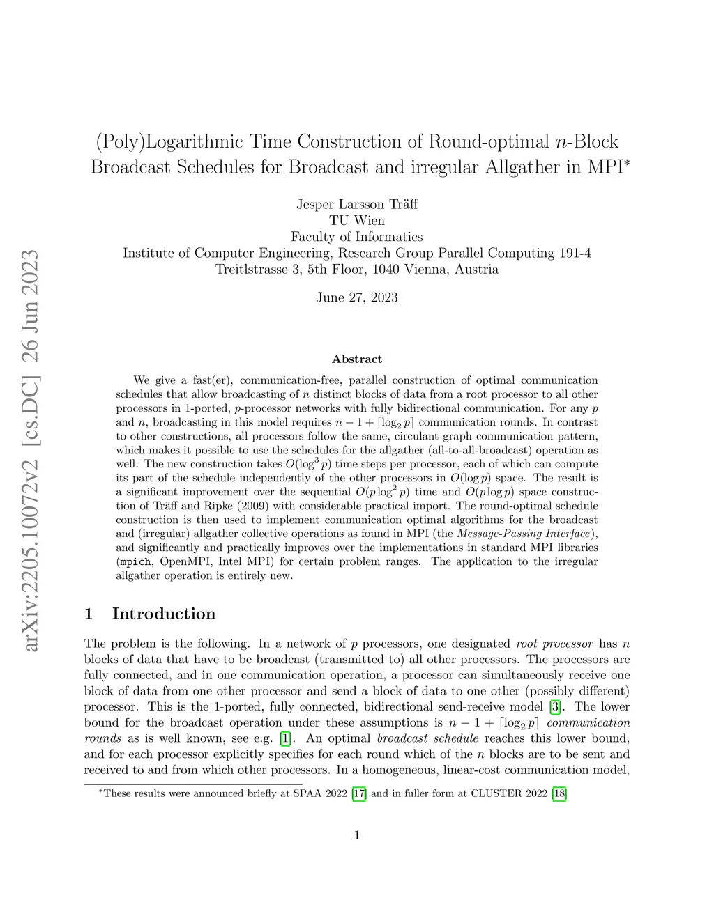 (Poly)Logarithmic Time Construction of Round-optimal -Block Broadcast