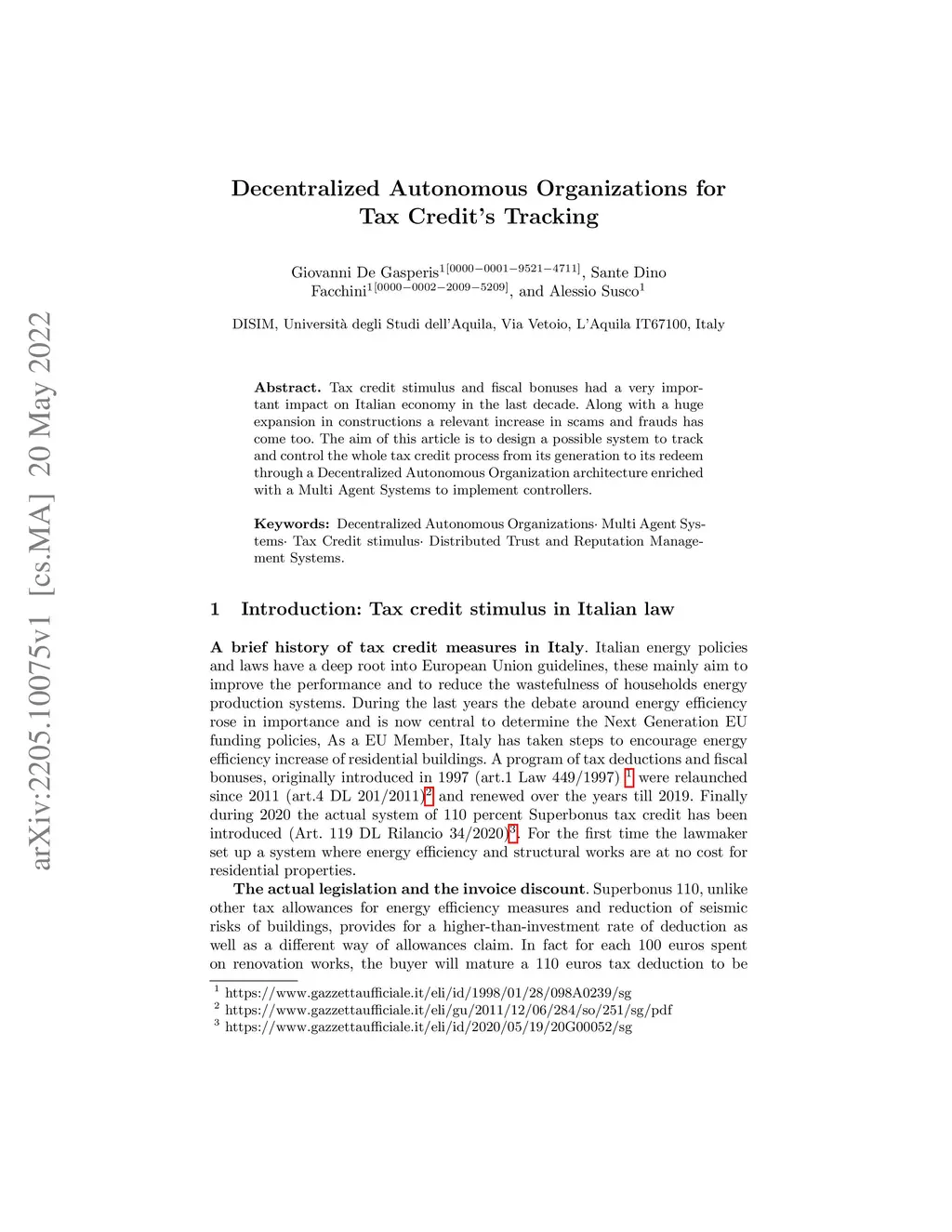 Tax credit stimulus and fiscal bonuses had a very important impact on Italian economy in the last decade. Along with a huge expansion in constructions a relevant increase in scams and frauds has come too. The aim of this article is to design a possible system to track and control the whole tax credit process from its generation to its redeem through a Decentralized Autonomous Organization architecture enriched with a Multi Agent Systems to implement controllers.