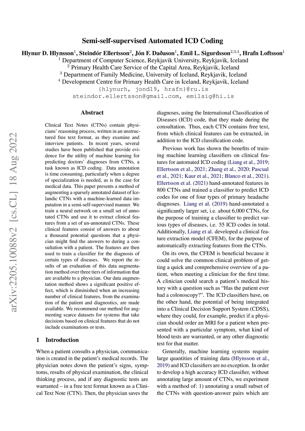Clinical Text Notes (CTNs) contain physicians' reasoning process, written in an unstructured free text format, as they examine and interview patients. In recent years, several studies have been published that provide evidence for the utility of machine learning for predicting doctors' diagnoses from CTNs, a task known as ICD coding. Data annotation is time consuming, particularly when a degree of specialization is needed, as is the case for medical data. This paper presents a method of augmenting a sparsely annotated dataset of Icelandic CTNs with a machine-learned imputation in a semi-self-supervised manner. We train a neural network on a small set of annotated CTNs and use it to extract clinical features from a set of un-annotated CTNs. These clinical features consist of answers to about a thousand potential questions that a physician might find the answers to during a consultation of a patient. The features are then used to train a classifier for the diagnosis of certain types of diseases. We report the results of an evaluation of this data augmentation method over three tiers of data availability to the physician. Our data augmentation method shows a significant positive effect which is diminished when clinical features from the examination of the patient and diagnostics are made available. We recommend our method for augmenting scarce datasets for systems that take decisions based on clinical features that do not include examinations or tests.