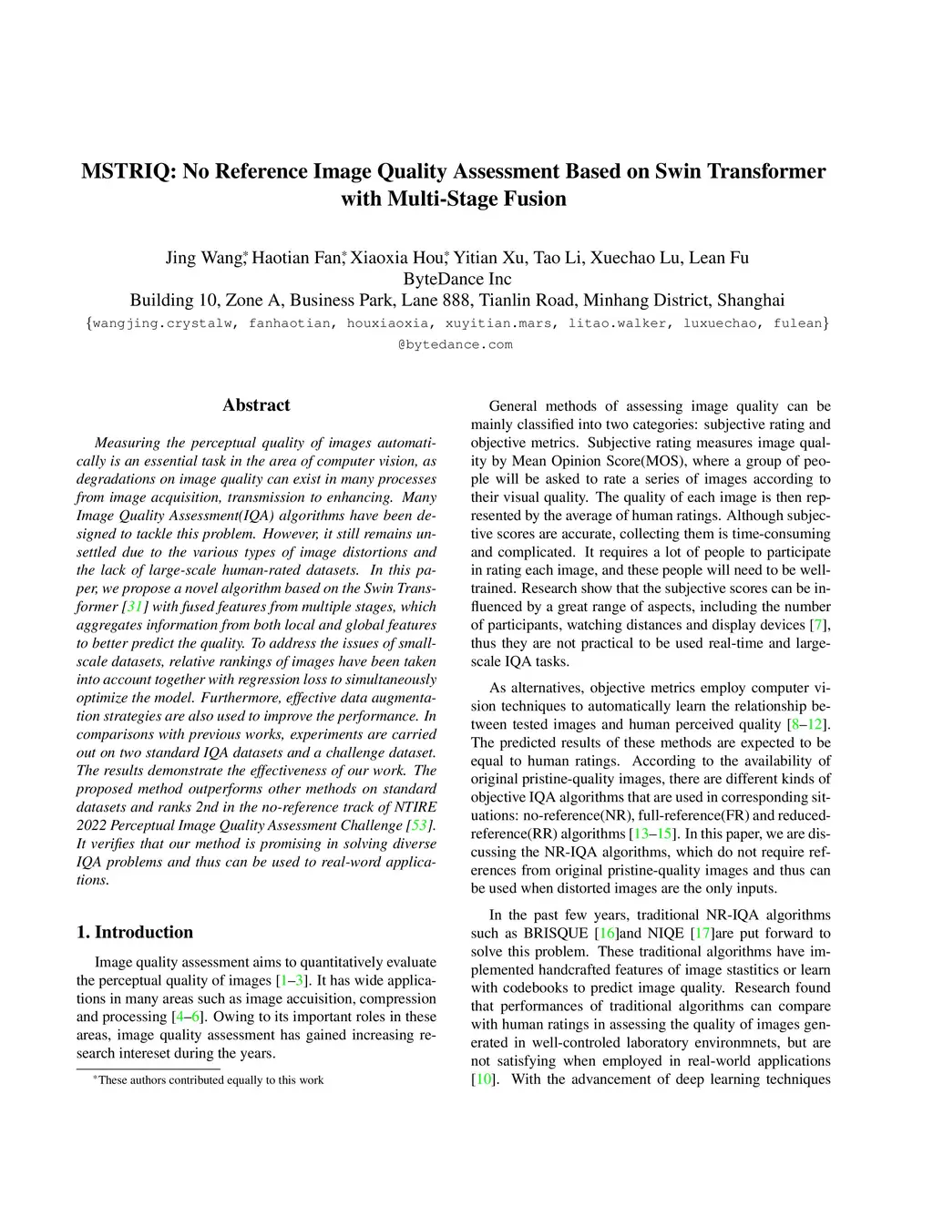 Measuring the perceptual quality of images automatically is an essential task in the area of computer vision, as degradations on image quality can exist in many processes from image acquisition, transmission to enhancing. Many Image Quality Assessment(IQA) algorithms have been designed to tackle this problem. However, it still remains un settled due to the various types of image distortions and the lack of large-scale human-rated datasets. In this paper, we propose a novel algorithm based on the Swin Transformer [31] with fused features from multiple stages, which aggregates information from both local and global features to better predict the quality. To address the issues of small-scale datasets, relative rankings of images have been taken into account together with regression loss to simultaneously optimize the model. Furthermore, effective data augmentation strategies are also used to improve the performance. In comparisons with previous works, experiments are carried out on two standard IQA datasets and a challenge dataset. The results demonstrate the effectiveness of our work. The proposed method outperforms other methods on standard datasets and ranks 2nd in the no-reference track of NTIRE 2022 Perceptual Image Quality Assessment Challenge [53]. It verifies that our method is promising in solving diverse IQA problems and thus can be used to real-word applications.