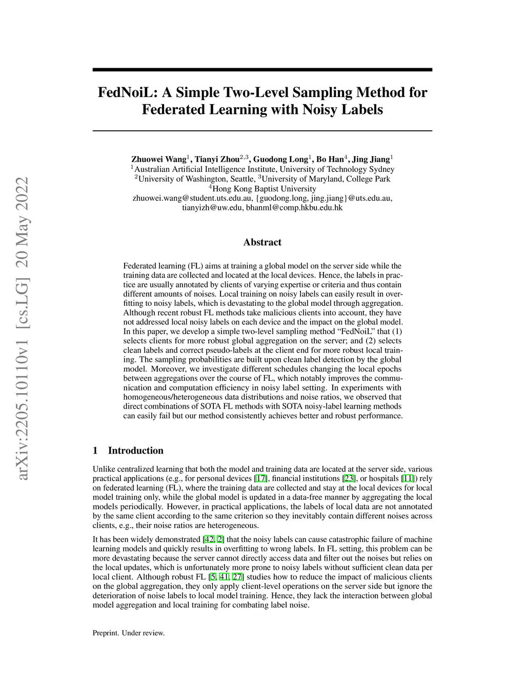 Federated learning (FL) aims at training a global model on the server side while the training data are collected and located at the local devices. Hence, the labels in practice are usually annotated by clients of varying expertise or criteria and thus contain different amounts of noises. Local training on noisy labels can easily result in overfitting to noisy labels, which is devastating to the global model through aggregation. Although recent robust FL methods take malicious clients into account, they have not addressed local noisy labels on each device and the impact to the global model. In this paper, we develop a simple two-level sampling method "FedNoiL" that (1) selects clients for more robust global aggregation on the server; and (2) selects clean labels and correct pseudo-labels at the client end for more robust local training. The sampling probabilities are built upon clean label detection by the global model. Moreover, we investigate different schedules changing the local epochs between aggregations over the course of FL, which notably improves the communication and computation efficiency in noisy label setting. In experiments with homogeneous/heterogeneous data distributions and noise ratios, we observed that direct combinations of SOTA FL methods with SOTA noisy-label learning methods can easily fail but our method consistently achieves better and robust performance.