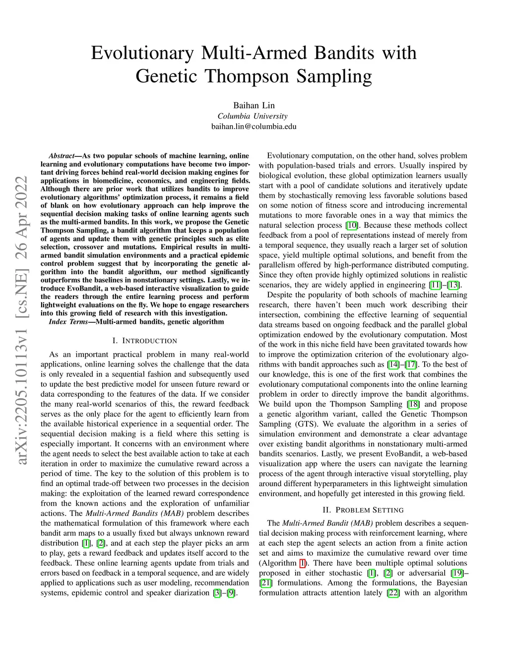 As two popular schools of machine learning, online learning and evolutionary computations have become two important driving forces behind real-world decision making engines for applications in biomedicine, economics, and engineering fields. Although there are prior work that utilizes bandits to improve evolutionary algorithms' optimization process, it remains a field of blank on how evolutionary approach can help improve the sequential decision making tasks of online learning agents such as the multi-armed bandits. In this work, we propose the Genetic Thompson Sampling, a bandit algorithm that keeps a population of agents and update them with genetic principles such as elite selection, crossover and mutations. Empirical results in multi-armed bandit simulation environments and a practical epidemic control problem suggest that by incorporating the genetic algorithm into the bandit algorithm, our method significantly outperforms the baselines in nonstationary settings. Lastly, we introduce EvoBandit, a web-based interactive visualization to guide the readers through the entire learning process and perform lightweight evaluations on the fly. We hope to engage researchers into this growing field of research with this investigation.