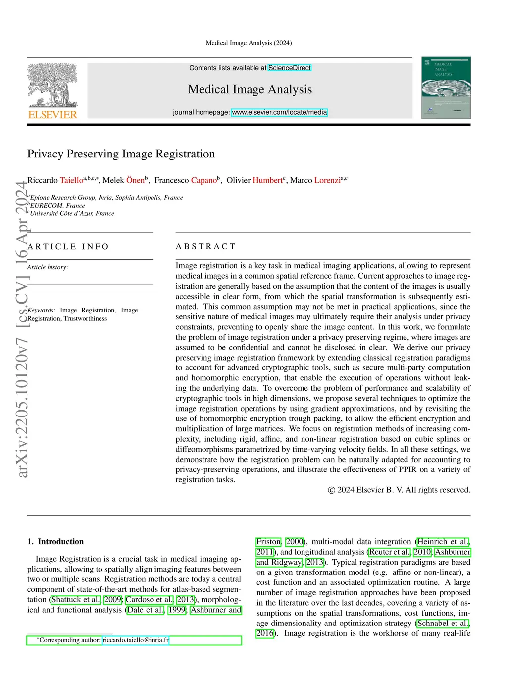 Image registration is a key task in medical imaging applications, allowing to represent medical images in a common spatial reference frame. Current literature on image registration is generally based on the assumption that images are usually accessible to the researcher, from which the spatial transformation is subsequently estimated. This common assumption may not be met in current practical applications, since the sensitive nature of medical images may ultimately require their analysis under privacy constraints, preventing to share the image content in clear form. In this work, we formulate the problem of image registration under a privacy preserving regime, where images are assumed to be confidential and cannot be disclosed in clear. We derive our privacy preserving image registration framework by extending classical registration paradigms to account for advanced cryptographic tools, such as secure multi-party computation and homomorphic encryption, that enable the execution of operations without leaking the underlying data. To overcome the problem of performance and scalability of cryptographic tools in high dimensions, we first propose to optimize the underlying image registration operations using gradient approximations. We further revisit the use of homomorphic encryption and use a packing method to allow the encryption and multiplication of large matrices more efficiently. We demonstrate our privacy preserving framework in linear and non-linear registration problems, evaluating its accuracy and scalability with respect to standard image registration. Our results show that privacy preserving image registration is feasible and can be adopted in sensitive medical imaging applications.