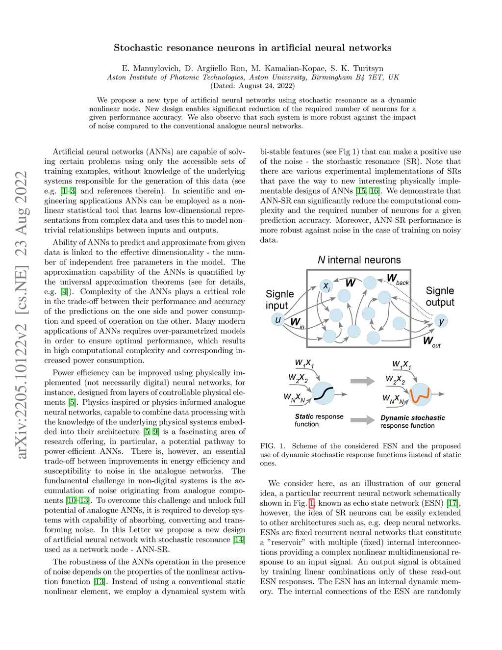 Many modern applications of the artificial neural networks ensue large number of layers making traditional digital implementations increasingly complex. Optical neural networks offer parallel processing at high bandwidth, but have the challenge of noise accumulation. We propose here a new type of neural networks using stochastic resonances as an inherent part of the architecture and demonstrate a possibility of significant reduction of the required number of neurons for a given performance accuracy. We also show that such a neural network is more robust against the impact of noise.