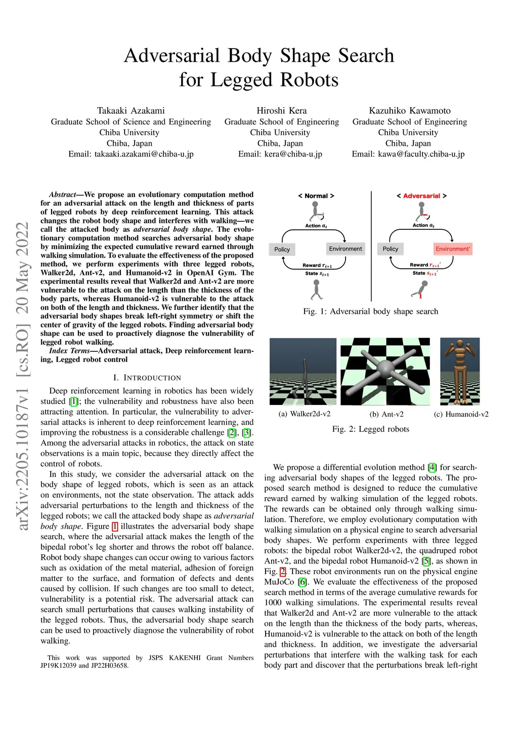 We propose an evolutionary computation method for an adversarial attack on the length and thickness of parts of legged robots by deep reinforcement learning. This attack changes the robot body shape and interferes with walking-we call the attacked body as adversarial body shape. The evolutionary computation method searches adversarial body shape by minimizing the expected cumulative reward earned through walking simulation. To evaluate the effectiveness of the proposed method, we perform experiments with three-legged robots, Walker2d, Ant-v2, and Humanoid-v2 in OpenAI Gym. The experimental results reveal that Walker2d and Ant-v2 are more vulnerable to the attack on the length than the thickness of the body parts, whereas Humanoid-v2 is vulnerable to the attack on both of the length and thickness. We further identify that the adversarial body shapes break left-right symmetry or shift the center of gravity of the legged robots. Finding adversarial body shape can be used to proactively diagnose the vulnerability of legged robot walking.