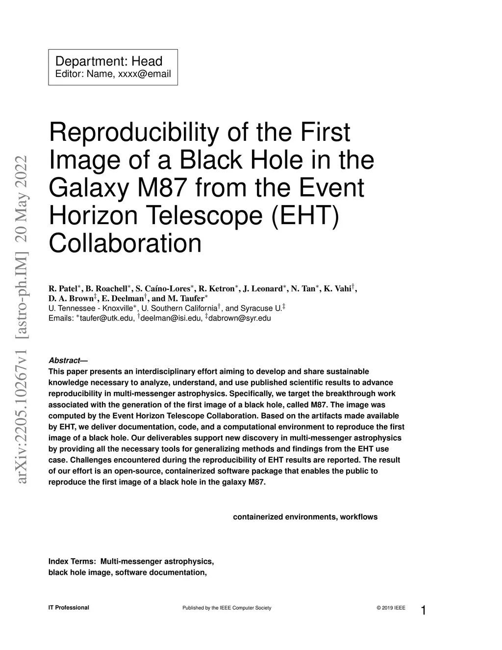 This paper presents an interdisciplinary effort aiming to develop and share sustainable knowledge necessary to analyze, understand, and use published scientific results to advance reproducibility in multi-messenger astrophysics. Specifically, we target the breakthrough work associated with the generation of the first image of a black hole, called M87. The image was computed by the Event Horizon Telescope Collaboration. Based on the artifacts made available by EHT, we deliver documentation, code, and a computational environment to reproduce the first image of a black hole. Our deliverables support new discovery in multi-messenger astrophysics by providing all the necessary tools for generalizing methods and findings from the EHT use case. Challenges encountered during the reproducibility of EHT results are reported. The result of our effort is an open-source, containerized software package that enables the public to reproduce the first image of a black hole in the galaxy M87.