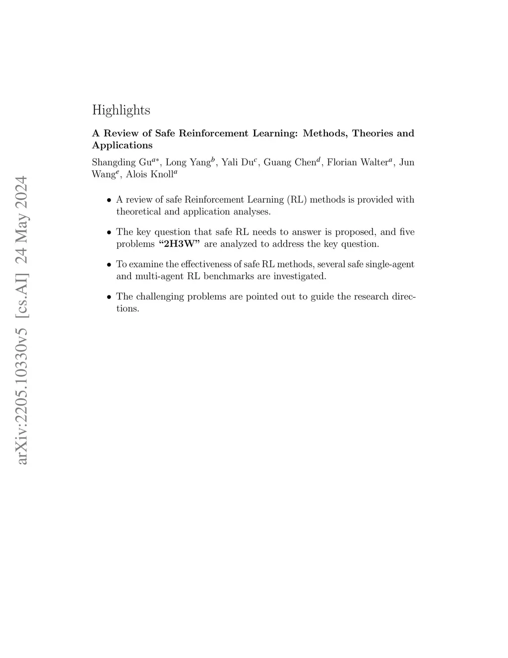 Reinforcement Learning (RL) has achieved tremendous success in many complex decision-making tasks. However, safety concerns are raised during deploying RL in real-world applications, leading to a growing demand for safe RL algorithms, such as in autonomous driving and robotics scenarios. While safe control has a long history, the study of safe RL algorithms is still in the early stages. To establish a good foundation for future safe RL research, in this paper, we provide a review of safe RL from the perspectives of methods, theories, and applications. Firstly, we review the progress of safe RL from five dimensions and come up with five crucial problems for safe RL being deployed in real-world applications, coined as "2H3W". Secondly, we analyze the algorithm and theory progress from the perspectives of answering the "2H3W" problems. Particularly, the sample complexity of safe RL algorithms is reviewed and discussed, followed by an introduction to the applications and benchmarks of safe RL algorithms. Finally, we open the discussion of the challenging problems in safe RL, hoping to inspire future research on this thread. To advance the study of safe RL algorithms, we release an open-sourced repository containing the implementations of major safe RL algorithms at the link: https://github.com/chauncygu/Safe-Reinforcement-Learning-Baselines.git.