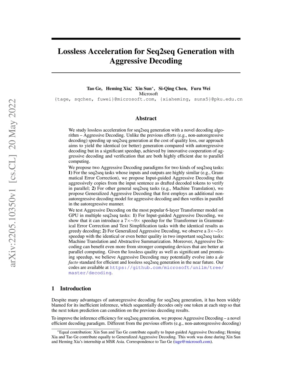 We study lossless acceleration for seq2seq generation with a novel decoding algorithm -- Aggressive Decoding. Unlike the previous efforts (e.g., non-autoregressive decoding) speeding up seq2seq generation at the cost of quality loss, our approach aims to yield the identical (or better) generation compared with autoregressive decoding but in a significant speedup, achieved by innovative cooperation of aggressive decoding and verification that are both efficient due to parallel computing. We propose two Aggressive Decoding paradigms for 2 kinds of seq2seq tasks: 1) For the seq2seq tasks whose inputs and outputs are highly similar (e.g., Grammatical Error Correction), we propose Input-guided Aggressive Decoding (IAD) that aggressively copies from the input sentence as drafted decoded tokens to verify in parallel; 2) For other general seq2seq tasks (e.g., Machine Translation), we propose Generalized Aggressive Decoding (GAD) that first employs an additional non-autoregressive decoding model for aggressive decoding and then verifies in parallel in the autoregressive manner. We test Aggressive Decoding on the most popular 6-layer Transformer model on GPU in multiple seq2seq tasks: 1) For IAD, we show that it can introduce a 7x-9x speedup for the Transformer in Grammatical Error Correction and Text Simplification tasks with the identical results as greedy decoding; 2) For GAD, we observe a 3x-5x speedup with the identical or even better quality in two important seq2seq tasks: Machine Translation and Abstractive Summarization. Moreover, Aggressive Decoding can benefit even more from stronger computing devices that are better at parallel computing. Given the lossless quality as well as significant and promising speedup, we believe Aggressive Decoding may potentially evolve into a de facto standard for efficient and lossless seq2seq generation in the near future.