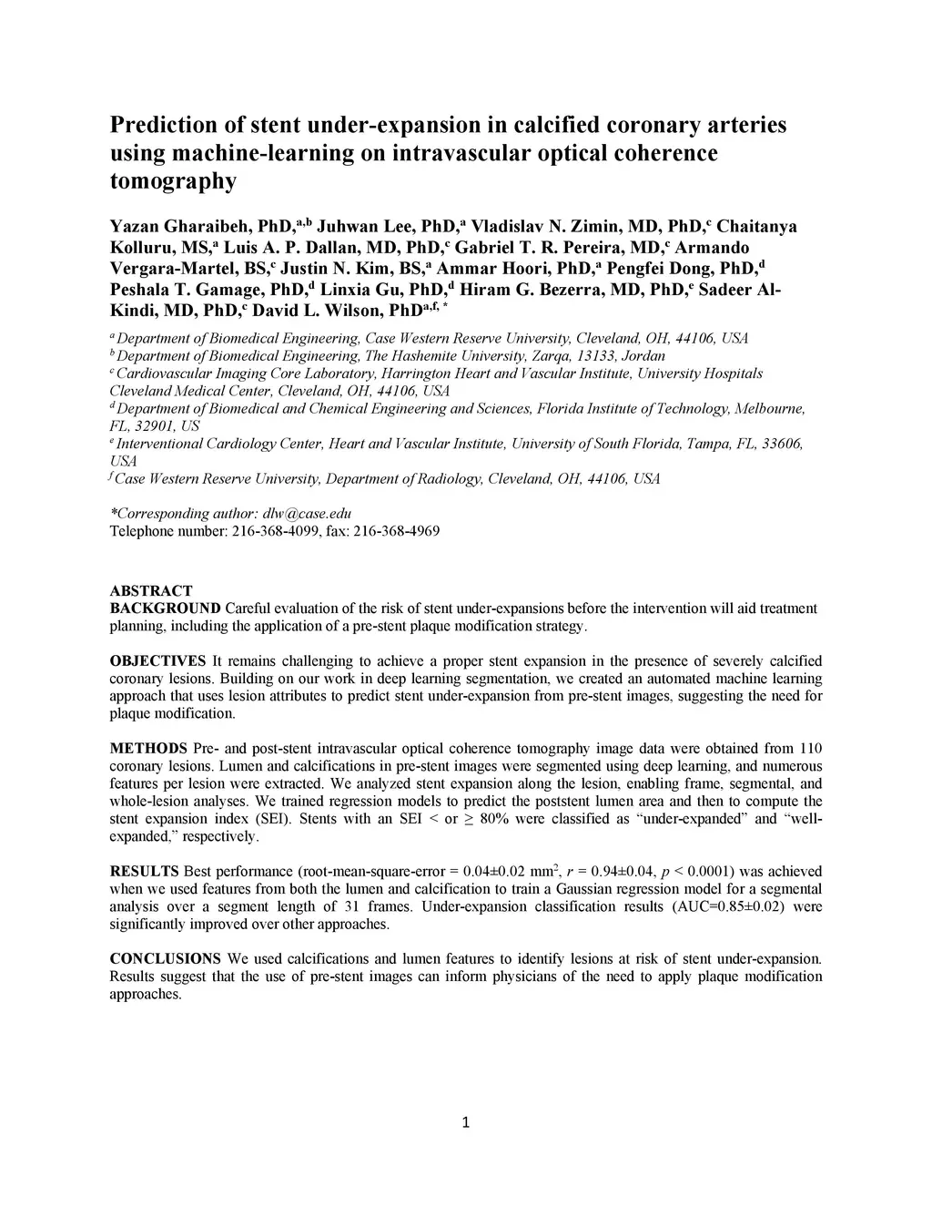BACKGROUND Careful evaluation of the risk of stent under-expansions before the intervention will aid treatment planning, including the application of a pre-stent plaque modification strategy. OBJECTIVES It remains challenging to achieve a proper stent expansion in the presence of severely calcified coronary lesions. Building on our work in deep learning segmentation, we created an automated machine learning approach that uses lesion attributes to predict stent under-expansion from pre-stent images, suggesting the need for plaque modification. METHODS Pre- and post-stent intravascular optical coherence tomography image data were obtained from 110 coronary lesions. Lumen and calcifications in pre-stent images were segmented using deep learning, and numerous features per lesion were extracted. We analyzed stent expansion along the lesion, enabling frame, segmental, and whole-lesion analyses. We trained regression models to predict the poststent lumen area and then to compute the stent expansion index (SEI). Stents with an SEI < or >/= 80% were classified as "under-expanded" and "well-expanded," respectively. RESULTS Best performance (root-mean-square-error = 0.04+/-0.02 mm2, r = 0.94+/-0.04, p < 0.0001) was achieved when we used features from both the lumen and calcification to train a Gaussian regression model for a segmental analysis over a segment length of 31 frames. Under-expansion classification results (AUC=0.85+/-0.02) were significantly improved over other approaches. CONCLUSIONS We used calcifications and lumen features to identify lesions at risk of stent under-expansion. Results suggest that the use of pre-stent images can inform physicians of the need to apply plaque modification approaches.