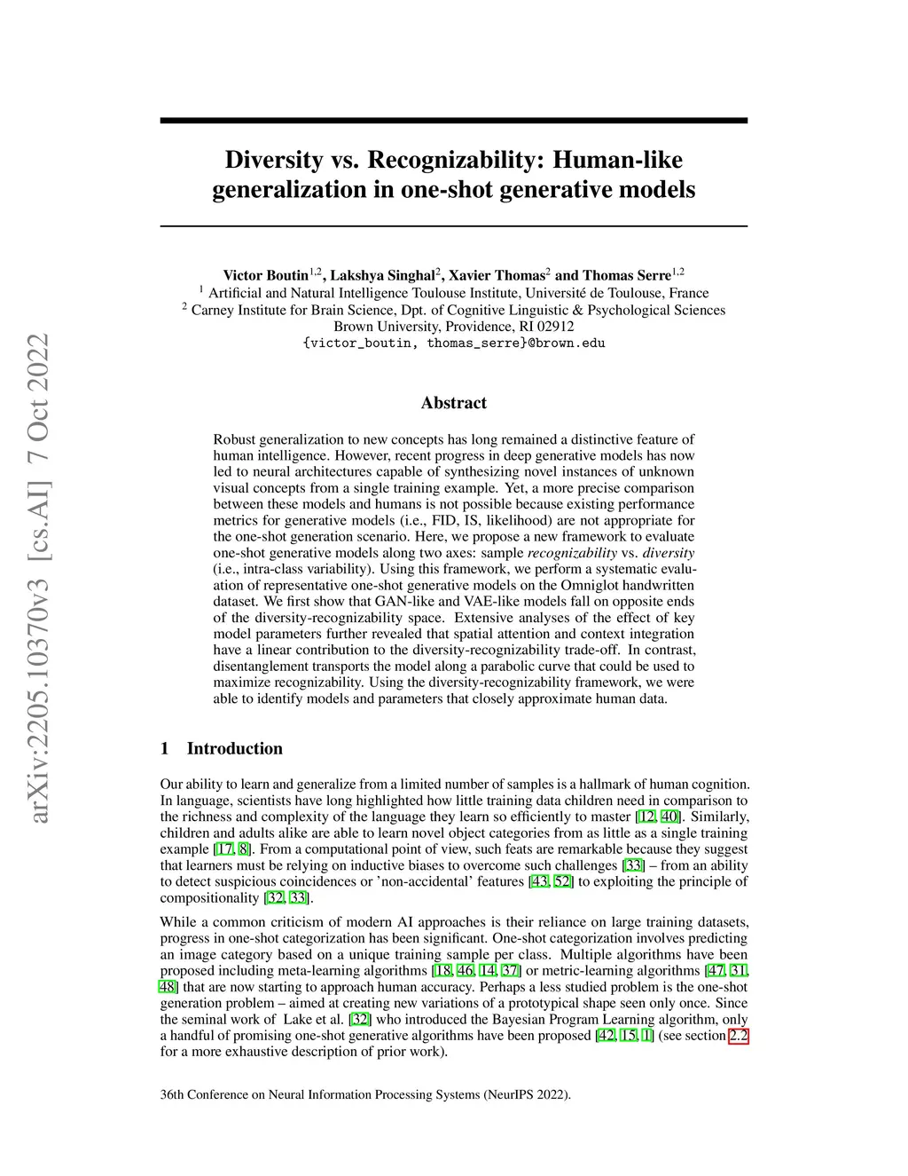 Robust generalization to new concepts has long remained a distinctive feature of human intelligence. However, recent progress in deep generative models has now led to neural architectures capable of synthesizing novel instances of unknown visual concepts from a single training example. Yet, a more precise comparison between these models and humans is not possible because existing performance metrics for generative models (i.e., FID, IS, likelihood) are not appropriate for the one-shot generation scenario. Here, we propose a new framework to evaluate one-shot generative models along two axes: sample recognizability vs. diversity (i.e., intra-class variability). Using this framework, we perform a systematic evaluation of representative one-shot generative models on the Omniglot handwritten dataset. We first show that GAN-like and VAE-like models fall on opposite ends of the diversity-recognizability space. Extensive analyses of the effect of key model parameters further revealed that spatial attention and context integration have a linear contribution to the diversity-recognizability trade-off. In contrast, disentanglement transports the model along a parabolic curve that could be used to maximize recognizability. Using the diversity-recognizability framework, we were able to identify models and parameters that closely approximate human data.