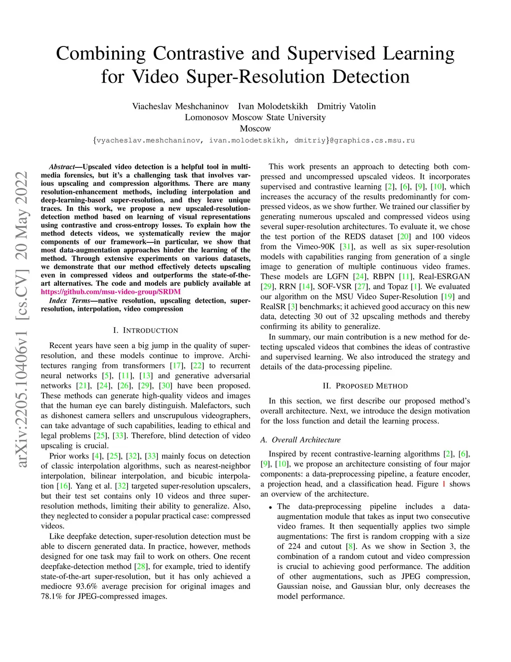 Upscaled video detection is a helpful tool in multimedia forensics, but it is a challenging task that involves various upscaling and compression algorithms. There are many resolution-enhancement methods, including interpolation and deep-learning-based super-resolution, and they leave unique traces. In this work, we propose a new upscaled-resolution-detection method based on learning of visual representations using contrastive and cross-entropy losses. To explain how the method detects videos, we systematically review the major components of our framework - in particular, we show that most data-augmentation approaches hinder the learning of the method. Through extensive experiments on various datasets, we demonstrate that our method effectively detects upscaling even in compressed videos and outperforms the state-of-the-art alternatives. The code and models are publicly available at https://github.com/msu-video-group/SRDM