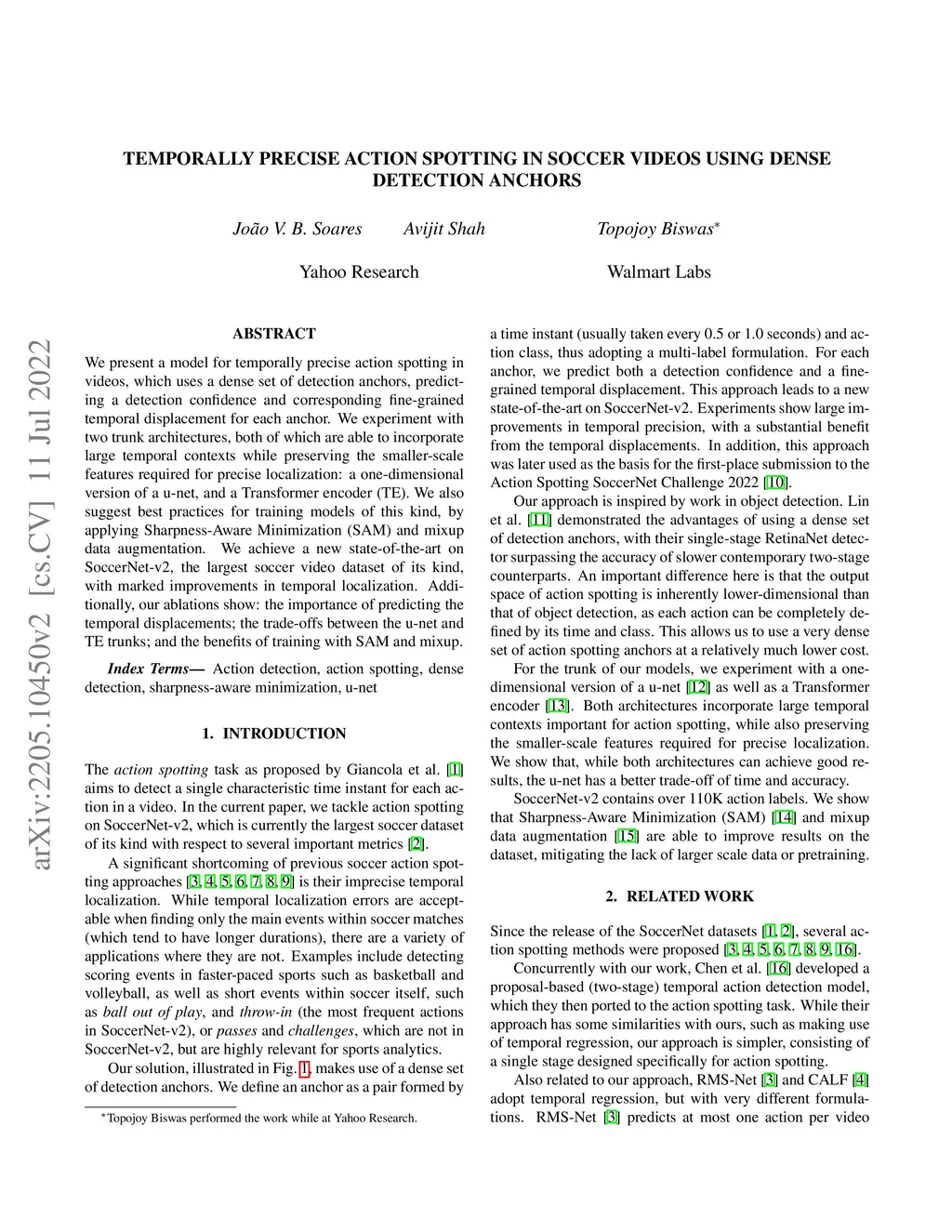 We present a model for temporally precise action spotting in videos, which uses a dense set of detection anchors, predicting a detection confidence and corresponding fine-grained temporal displacement for each anchor. We experiment with two trunk architectures, both of which are able to incorporate large temporal contexts while preserving the smaller-scale features required for precise localization: a one-dimensional version of a u-net, and a Transformer encoder (TE). We also suggest best practices for training models of this kind, by applying Sharpness-Aware Minimization (SAM) and mixup data augmentation. We achieve a new state-of-the-art on SoccerNet-v2, the largest soccer video dataset of its kind, with marked improvements in temporal localization. Additionally, our ablations show: the importance of predicting the temporal displacements; the trade-offs between the u-net and TE trunks; and the benefits of training with SAM and mixup.