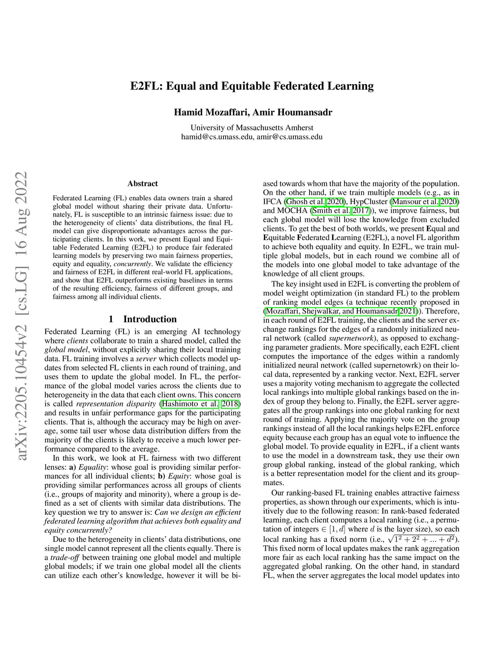 Federated Learning (FL) enables data owners to train a shared global model without sharing their private data. Unfortunately, FL is susceptible to an intrinsic fairness issue: due to heterogeneity in clients' data distributions, the final trained model can give disproportionate advantages across the participating clients. In this work, we present Equal and Equitable Federated Learning (E2FL) to produce fair federated learning models by preserving two main fairness properties, equity and equality, concurrently. We validate the efficiency and fairness of E2FL in different real-world FL applications, and show that E2FL outperforms existing baselines in terms of the resulting efficiency, fairness of different groups, and fairness among all individual clients.