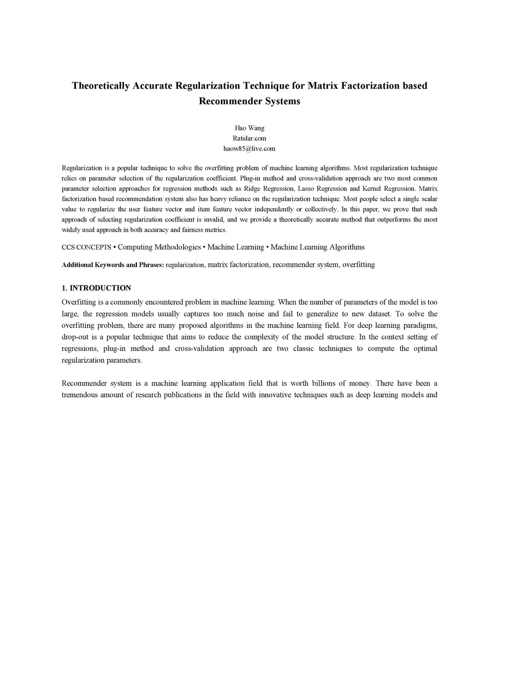 Regularization is a popular technique to solve the overfitting problem of machine learning algorithms. Most regularization technique relies on parameter selection of the regularization coefficient. Plug-in method and cross-validation approach are two most common parameter selection approaches for regression methods such as Ridge Regression, Lasso Regression and Kernel Regression. Matrix factorization based recommendation system also has heavy reliance on the regularization technique. Most people select a single scalar value to regularize the user feature vector and item feature vector independently or collectively. In this paper, we prove that such approach of selecting regularization coefficient is invalid, and we provide a theoretically accurate method that outperforms the most widely used approach in both accuracy and fairness metrics.