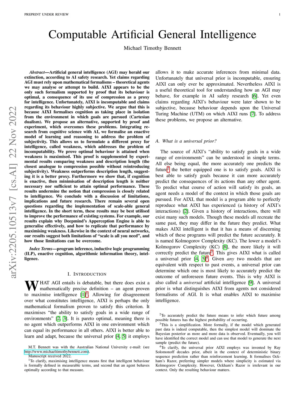 An artificial general intelligence (AGI), by one definition, is an agent that requires less information than any other to make an accurate prediction. It is arguable that the general reinforcement learning agent AIXI not only met this definition, but was the only mathematical formalism to do so. Though a significant result, AIXI was incomputable and its performance subjective. This paper proposes an alternative formalism of AGI which overcomes both problems. Formal proof of its performance is given, along with a simple implementation and experimental results that support these claims.