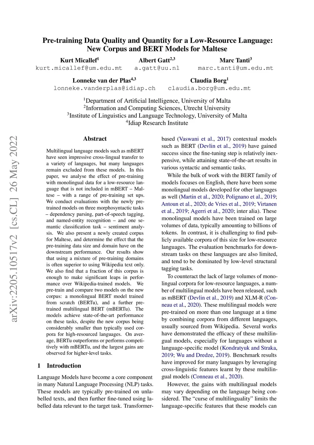 Corpus and BERT Models for Maltese