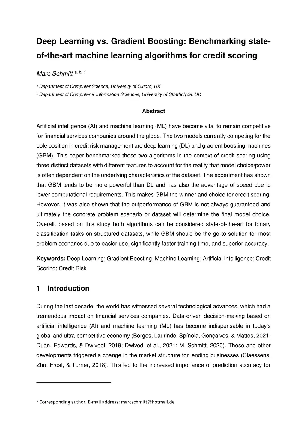 Artificial intelligence (AI) and machine learning (ML) have become vital to remain competitive for financial services companies around the globe. The two models currently competing for the pole position in credit risk management are deep learning (DL) and gradient boosting machines (GBM). This paper benchmarked those two algorithms in the context of credit scoring using three distinct datasets with different features to account for the reality that model choice/power is often dependent on the underlying characteristics of the dataset. The experiment has shown that GBM tends to be more powerful than DL and has also the advantage of speed due to lower computational requirements. This makes GBM the winner and choice for credit scoring. However, it was also shown that the outperformance of GBM is not always guaranteed and ultimately the concrete problem scenario or dataset will determine the final model choice. Overall, based on this study both algorithms can be considered state-of-the-art for binary classification tasks on structured datasets, while GBM should be the go-to solution for most problem scenarios due to easier use, significantly faster training time, and superior accuracy.