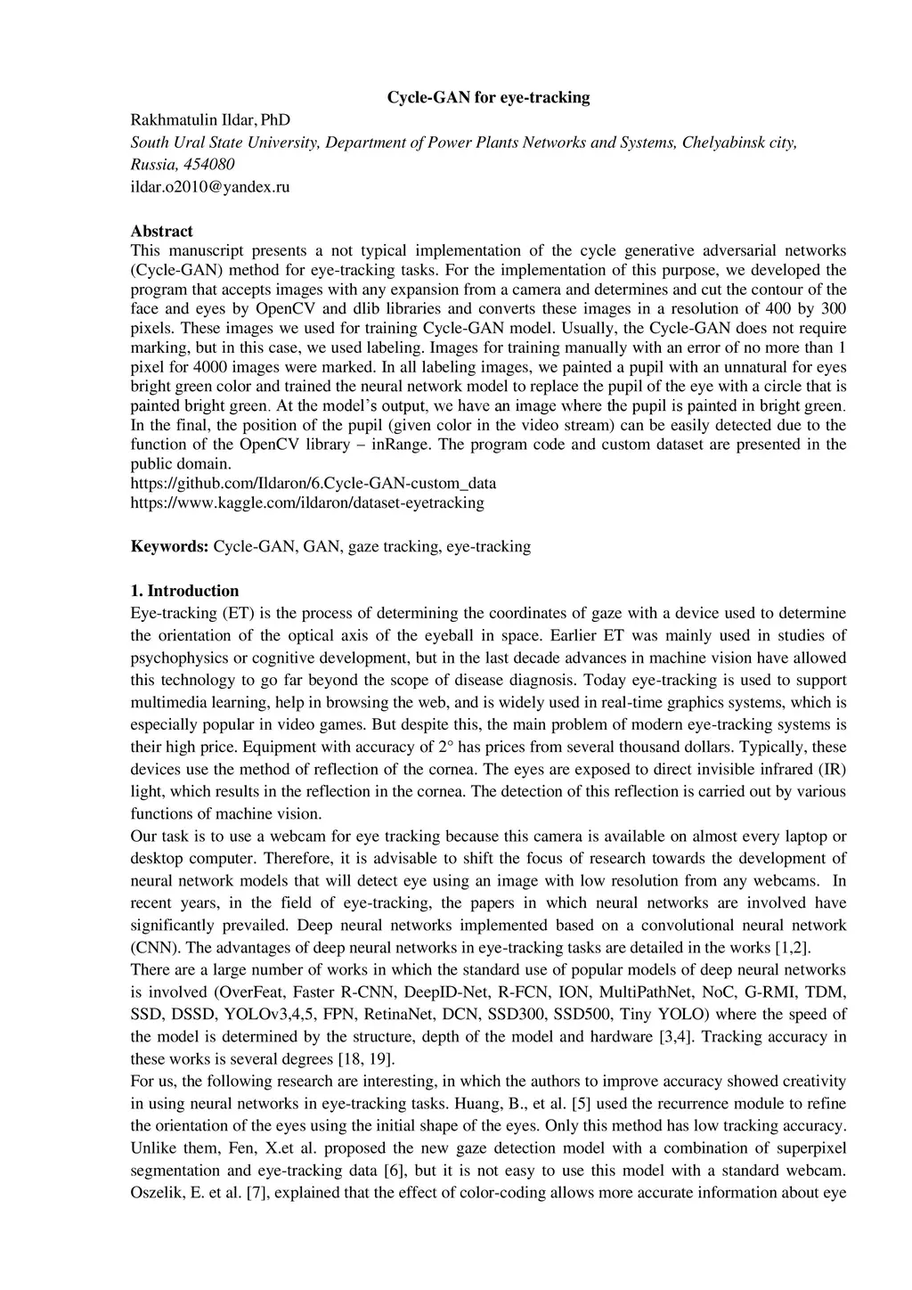 This manuscript presents a not typical implementation of the cycle generative adversarial networks (Cycle-GAN) method for eye-tracking tasks.