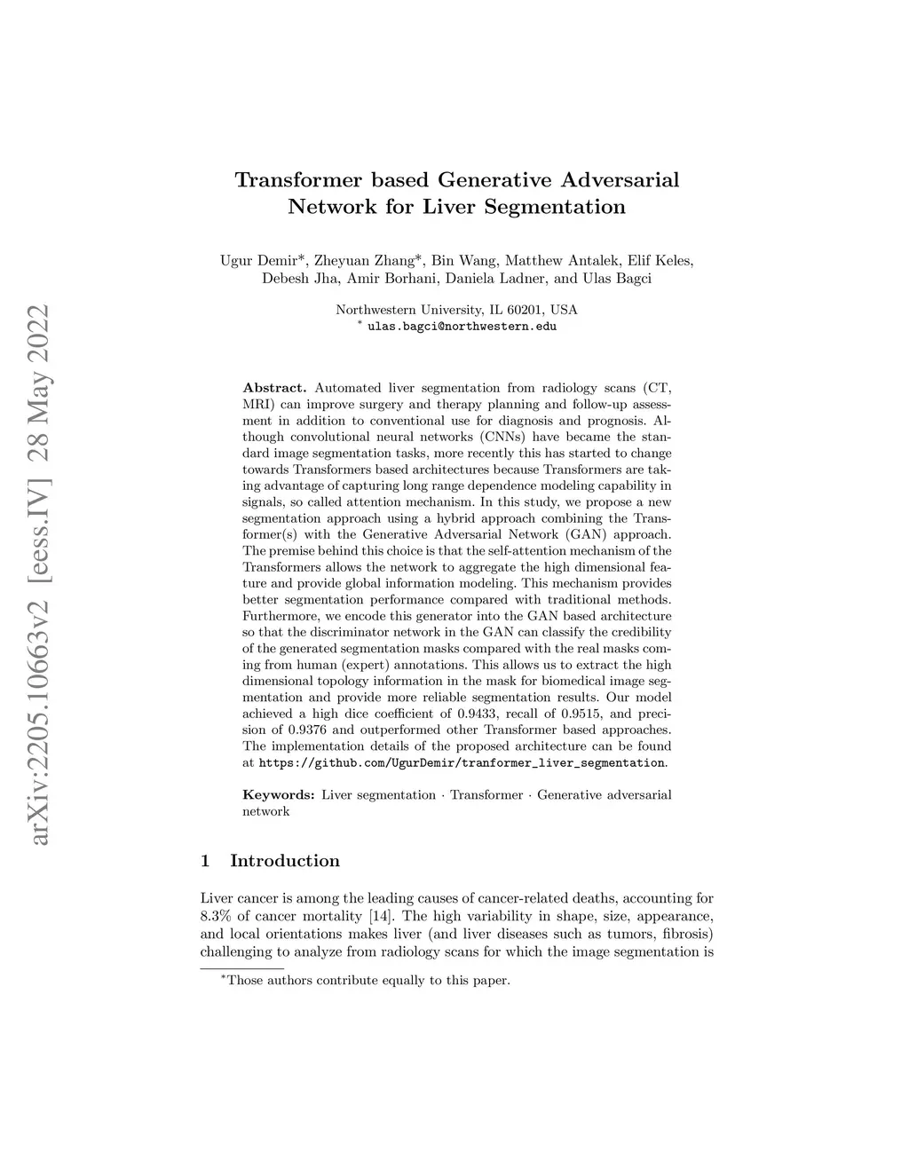 Transformer based Generative Adversarial Network for Liver Segmentation